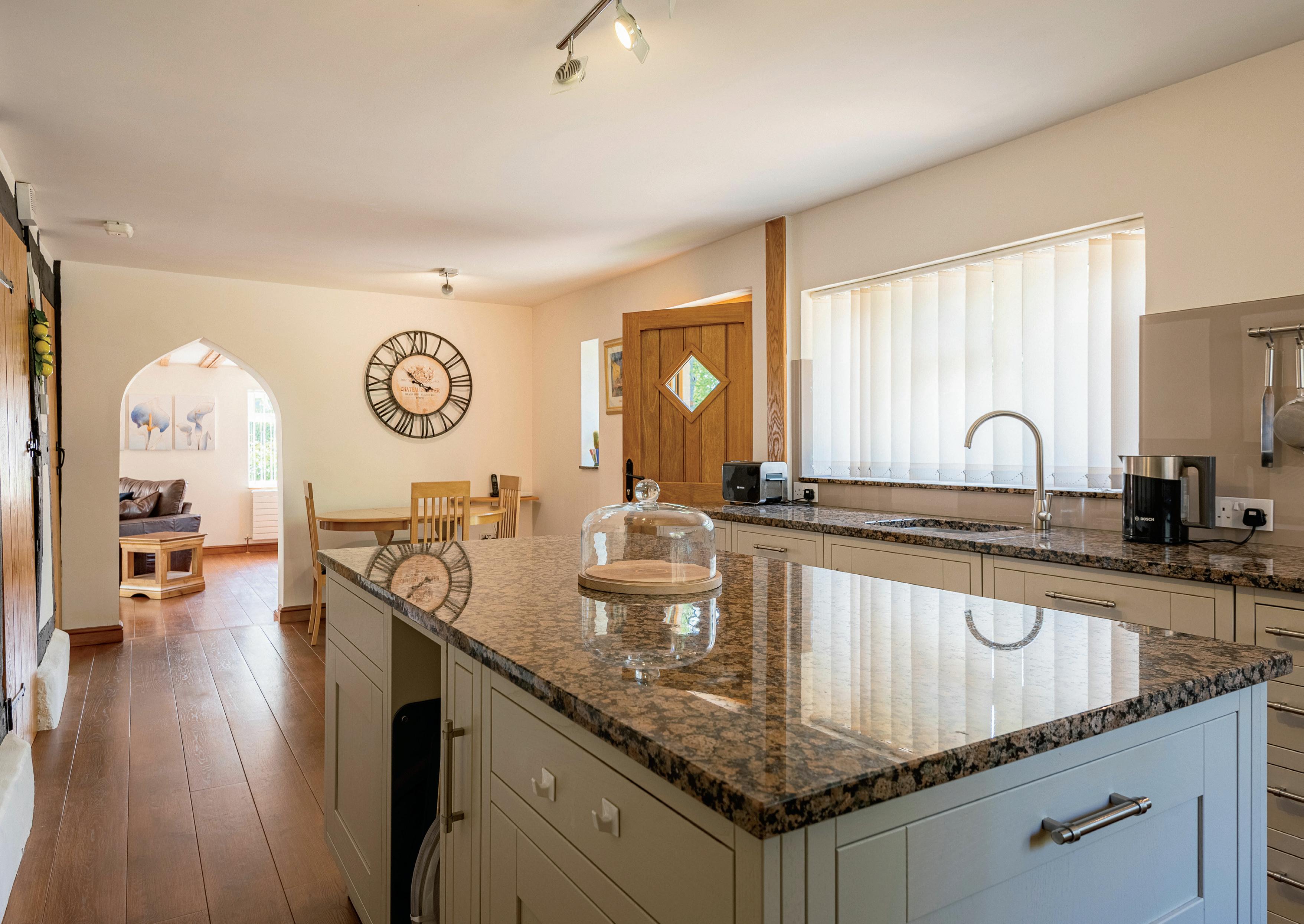 Kitchen Breakfast Room: A range of fitted Magnet units, granite work surfaces, built in Bosch oven, built in Bosch self-cleaning oven, fitted Bosch induction hob with extractor over, sink and drainer, built in Bosch fridge freezer, built in Bosch dish washer, central island with storage draws, exposed timbers, pantry, radiator.