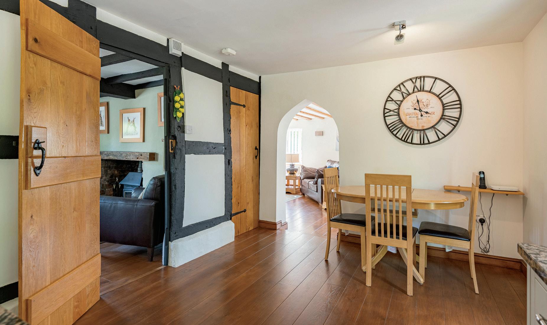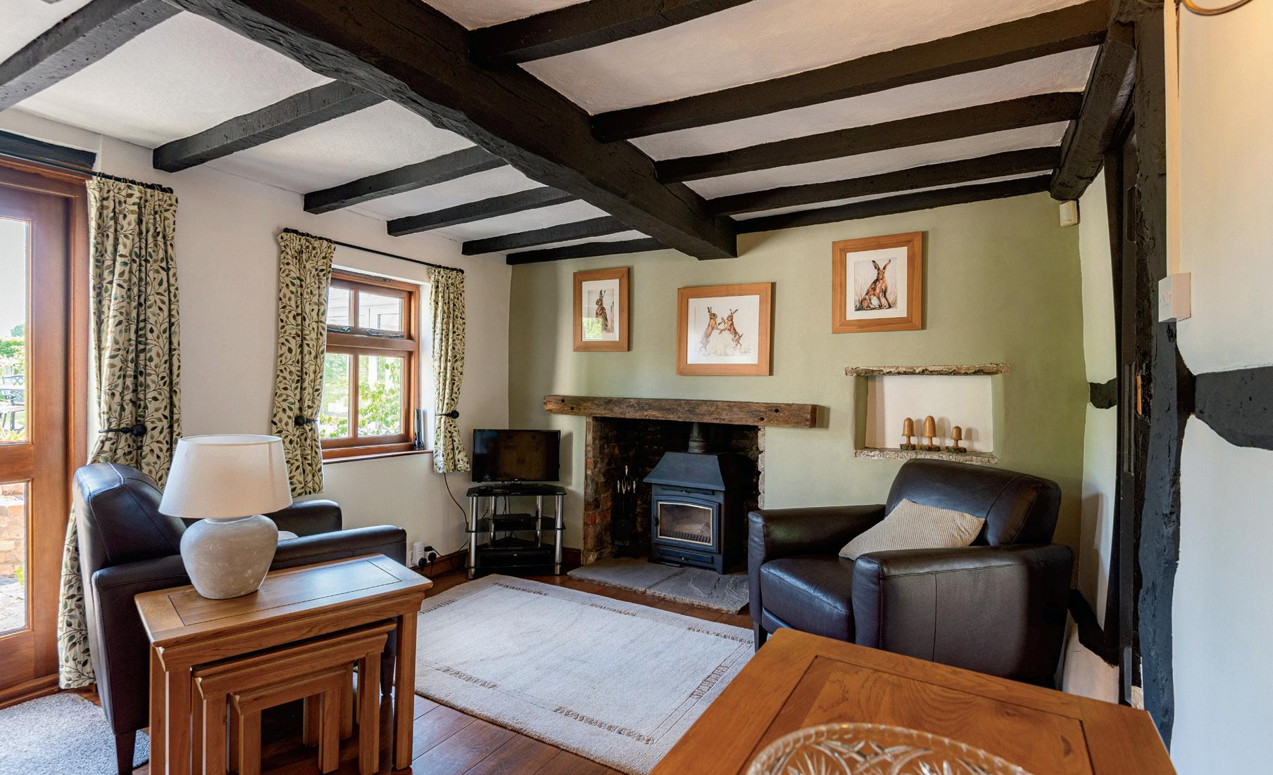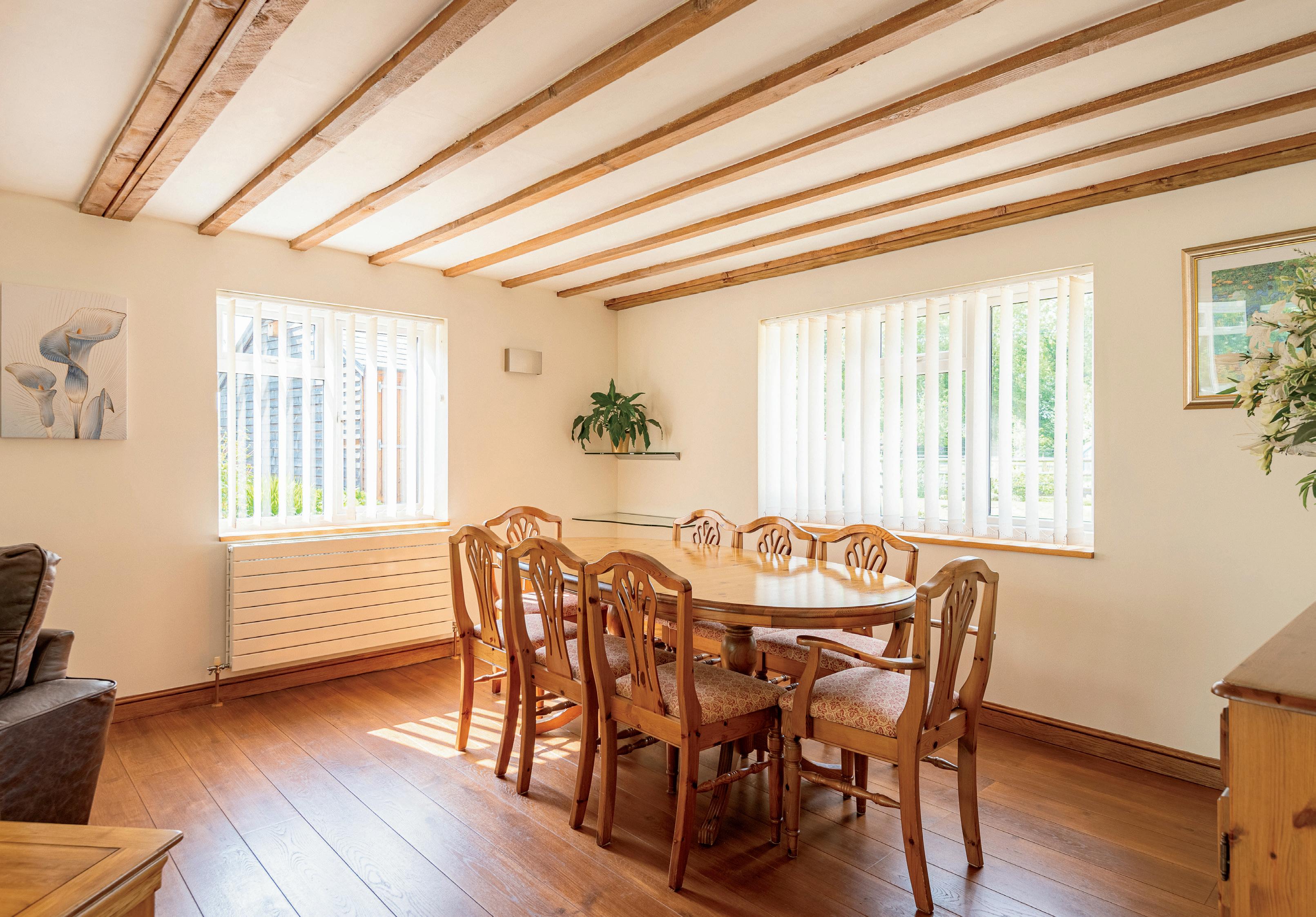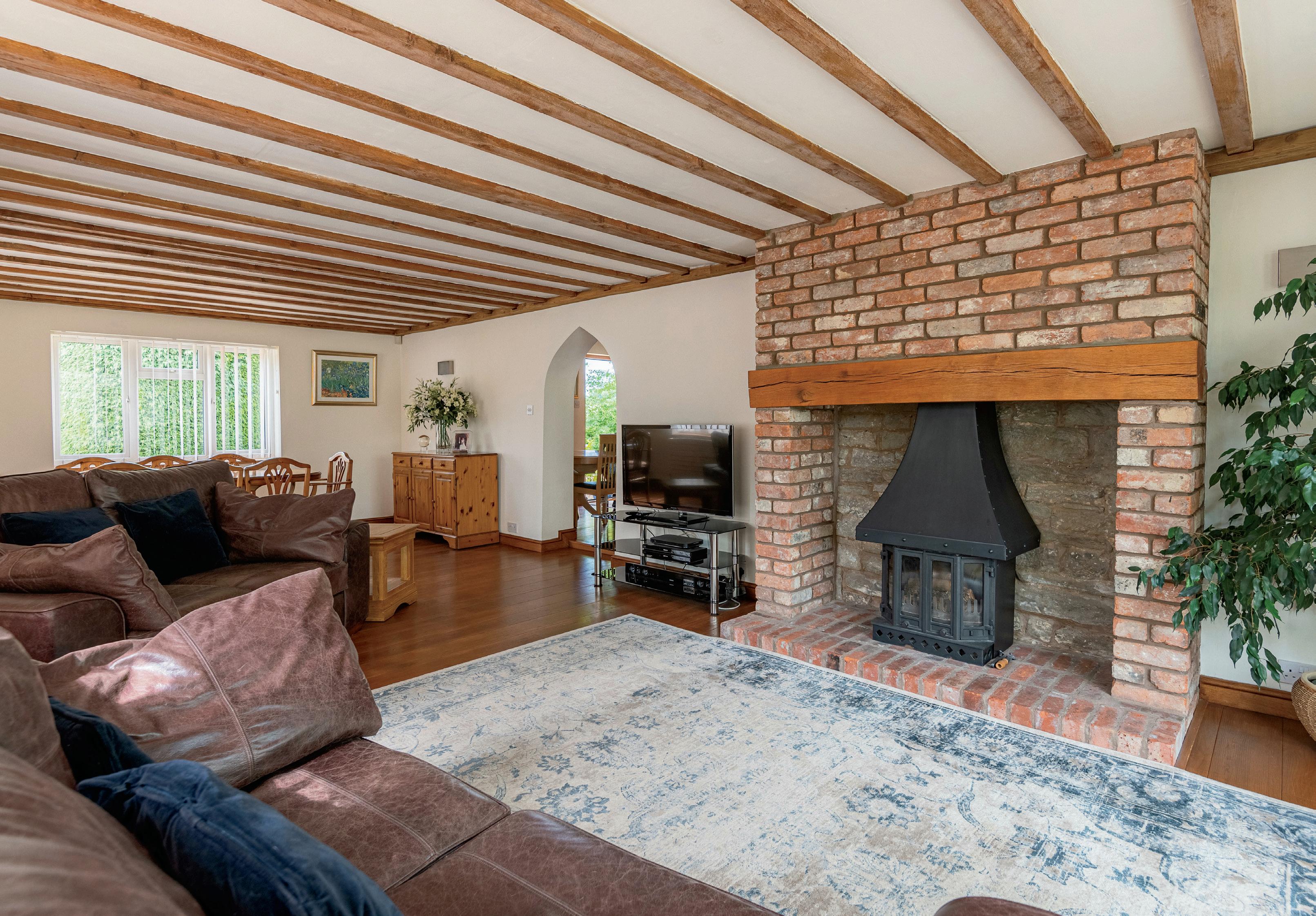 Living/Dining Room: Garden views, feature fireplace with wood burning stove, exposed ceiling timbers, radiators.