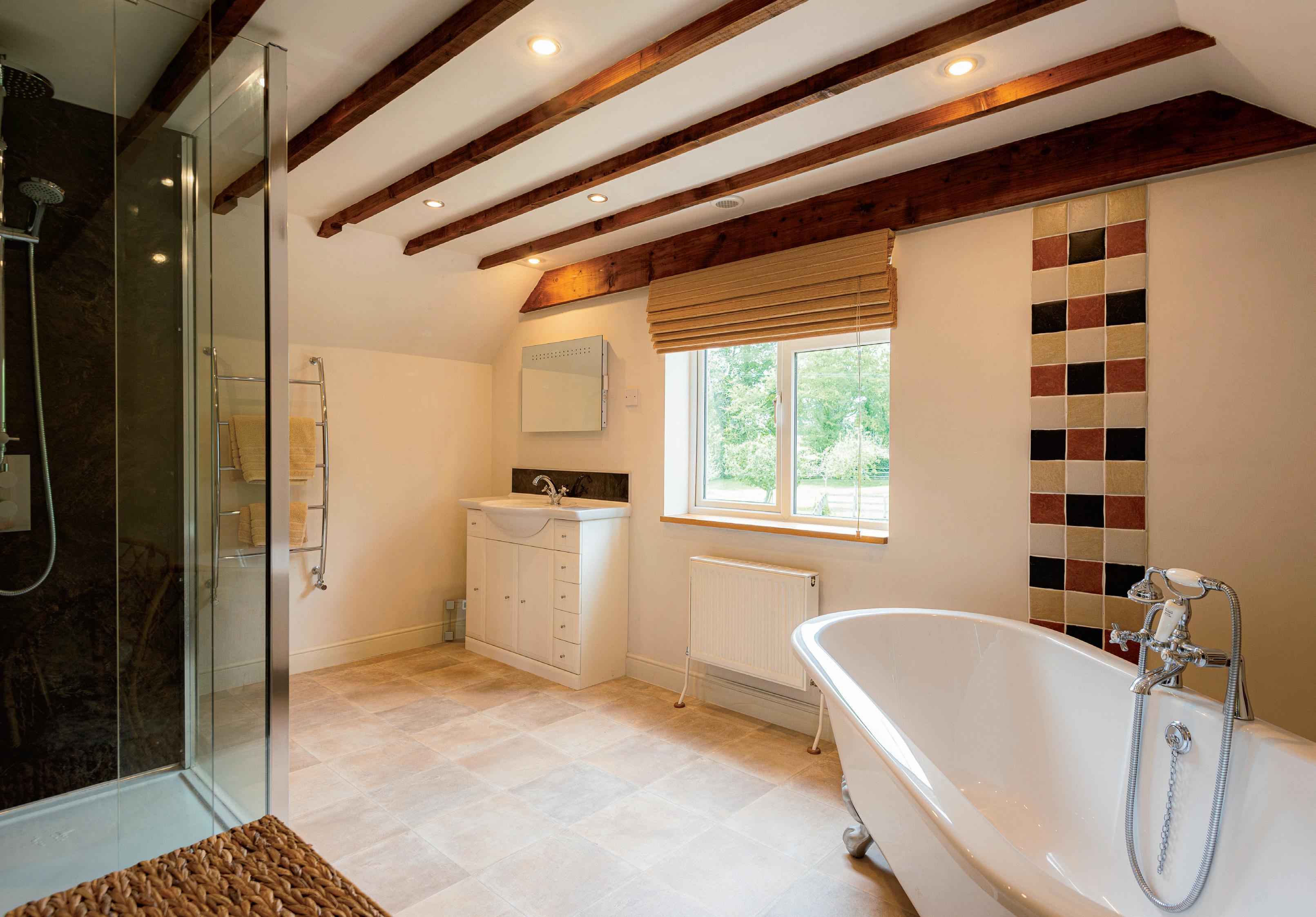 En-Suite Bathroom: Garden views, WC, wash basin with cupboards below, roll top bath, shower cubicle with wall mounted shower, wall mounted mirror, heated towel rail.