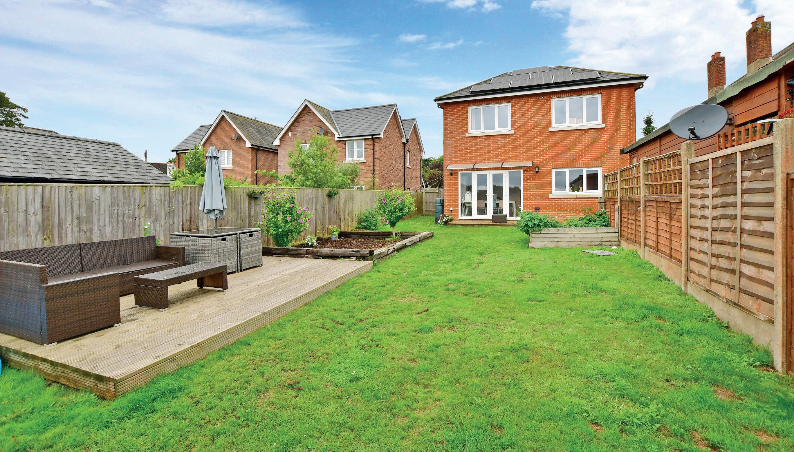 Outside the stone effect front driveway provides off road parking for two cars while at the rear of the property the large garden is currently subdivided with the over ground pool and play area located in the lower section. There is a spacious decked terrace that is ideal for al fresco dining or just sitting watching the kids playing in the above-ground swimming pool, a small vegetable patch and sleepers that surround plants and ornamental trees.
