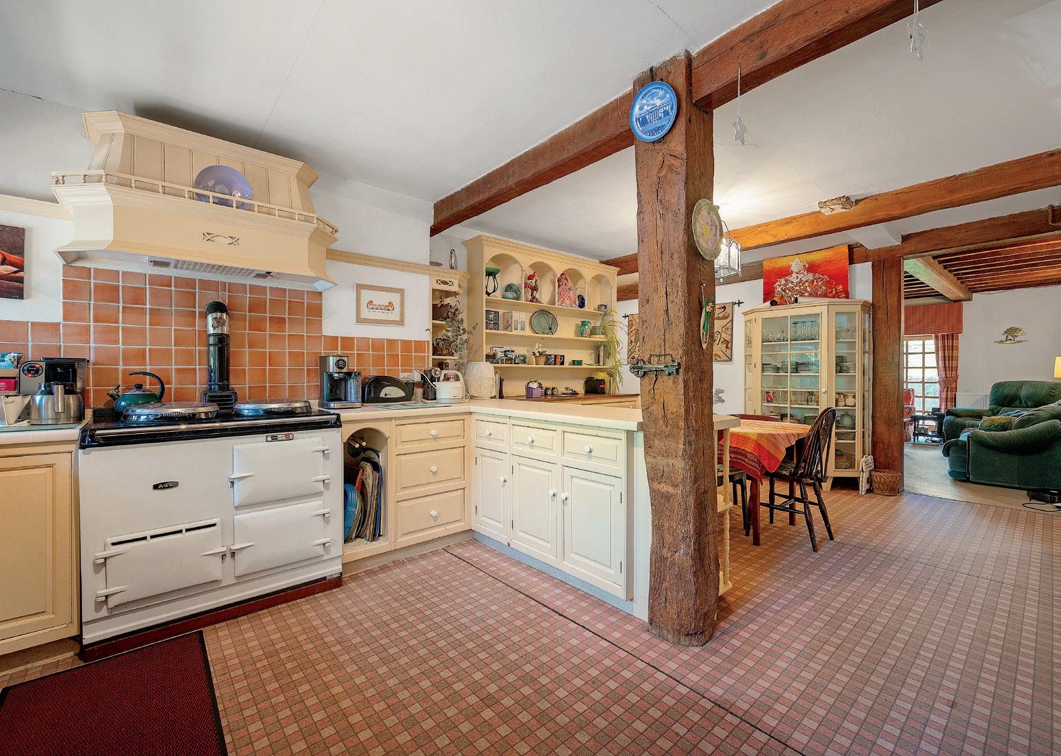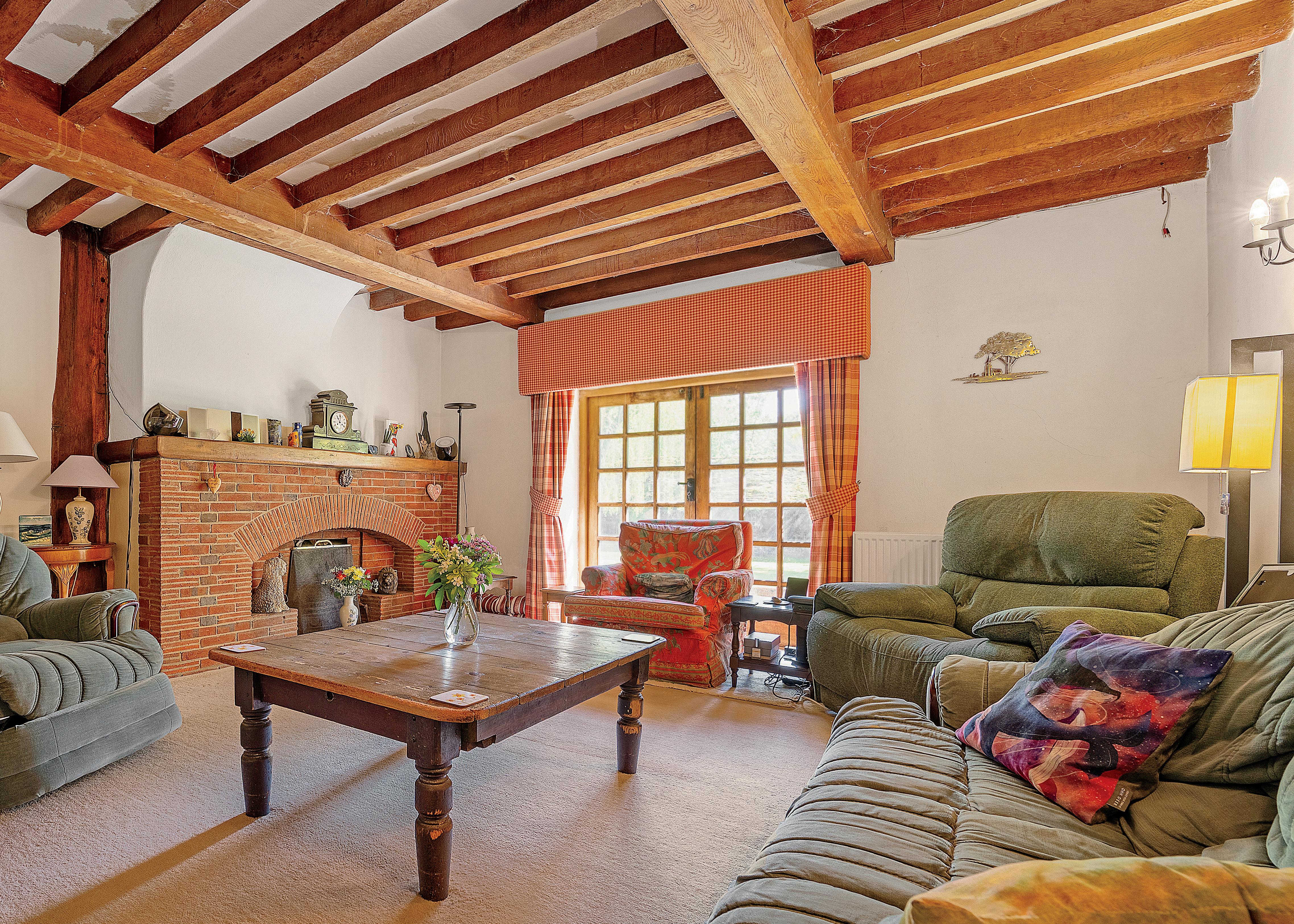 Internally, the rooms are spacious and light and evidence of the barn’s great oak frame – which supports the house - can be seen throughout. Principal rooms are to the rear south facing side of the house and benefit from the sun all day while overlooking the private garden. There are open fires in the sitting and drawing rooms, that in the drawing room being an impressive inglenook with wood burning stove. The kitchen has an Aga.