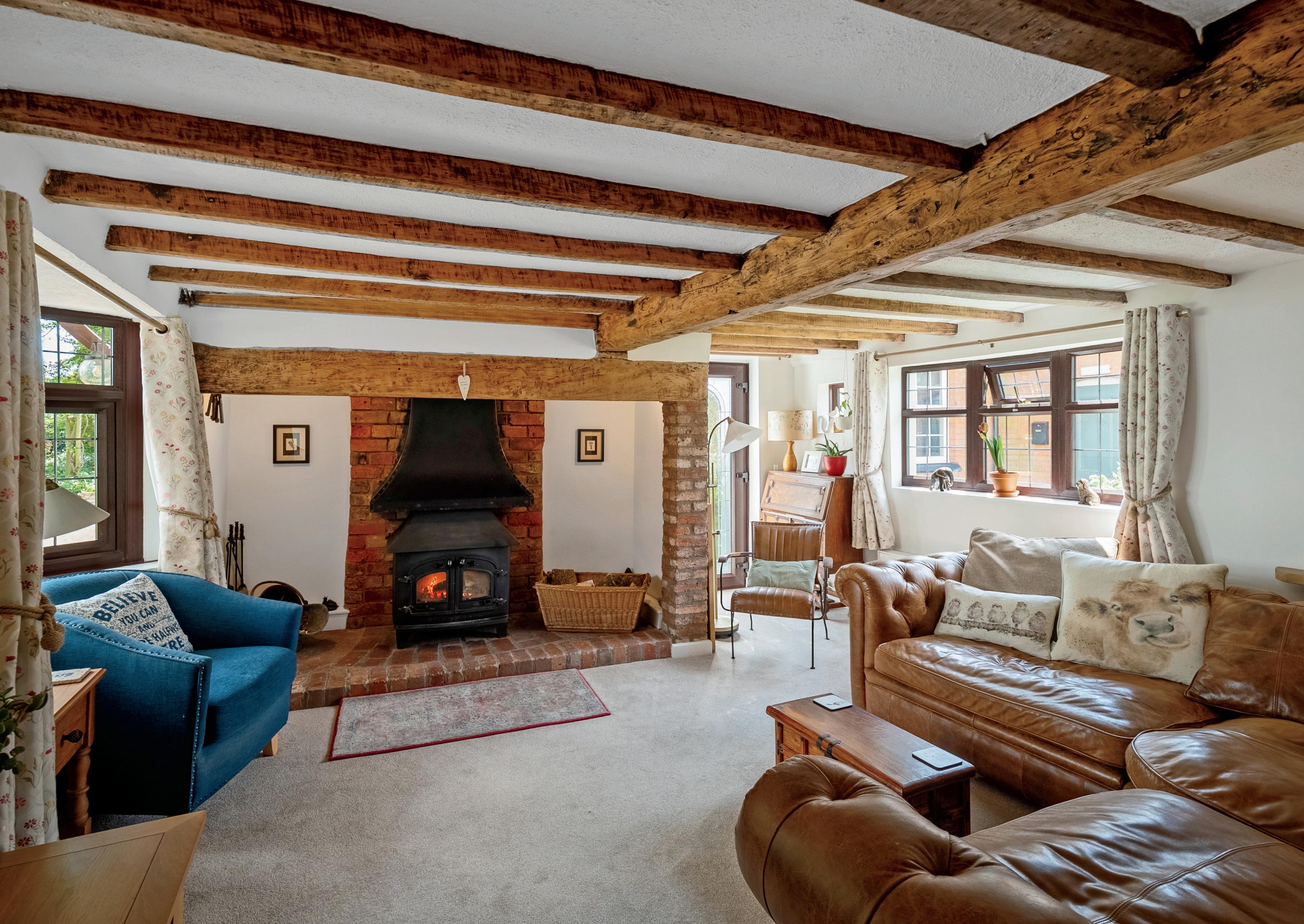 The sitting room exudes character, centred around a striking, exposed brick inglenook fireplace housing a cast iron log burner, complemented by a timber beam and brick hearth. A glazed door provides access to the garden, inviting indoor-outdoor flow, while an adjoining door leads to the beautifully appointed downstairs cloakroom. This cloakroom boasts wood effect flooring, original beams accentuating the walls and ceiling, tongue and groove panelling, and a bespoke built vanity unit featuring cupboard space, a wooden top, and a ceramic wash hand basin, accompanied by a low flush WC.