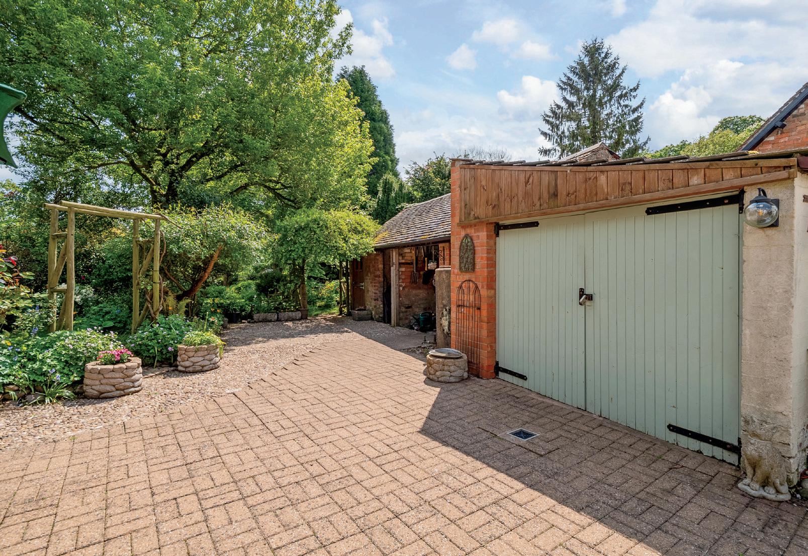 The garage, accessible from within the courtyard, boasts double opening doors, providing convenient parking space. Adjoining the garage is a brick-built, three-bay outbuilding, featuring two open-fronted storage areas, one leading to a useful potting room with a workbench, and another closed storage area, offering ample storage solutions for outdoor equipment and gardening essentials.