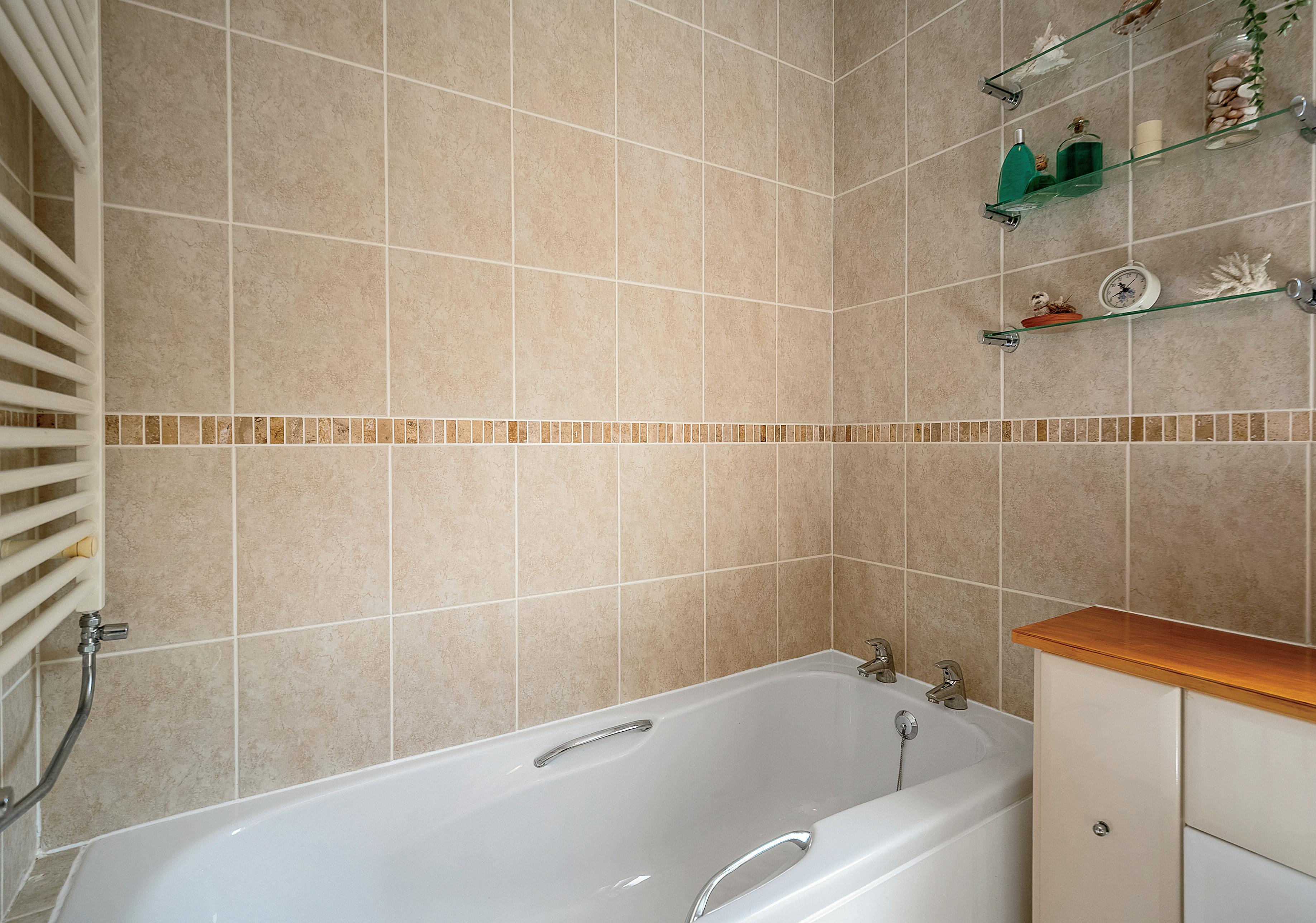 The family bathroom is well designed with good-quality fixtures and fittings. It features a bathtub separate shower, a stylish vanity unit, and plenty of storage space, providing both functionality and luxury.