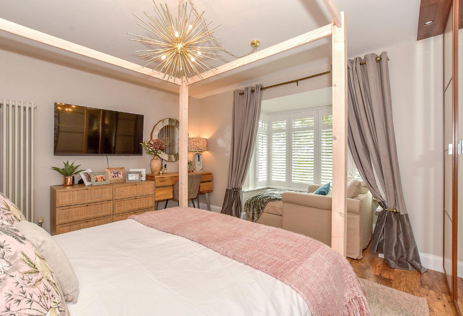 The well-proportioned lounge is delightful with its decorated chimney breast, brick surround fireplace and log burning stove as a charming focal point as well as painted ceiling beams, dado and picture rails and a bay window with plantation shutters that are also found on all the other front bay windows. This has a door to a ground floor double bedroom that could always be used as an office or snug and has French doors to the rear garden.