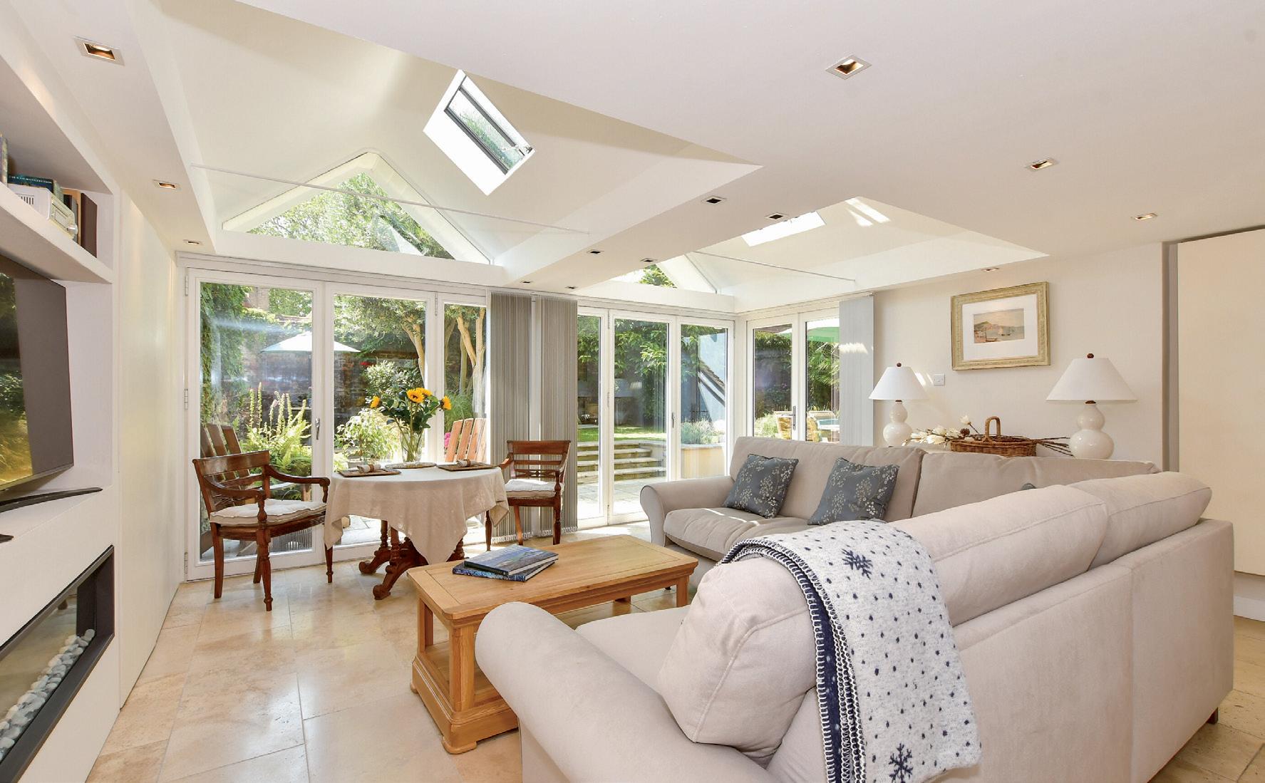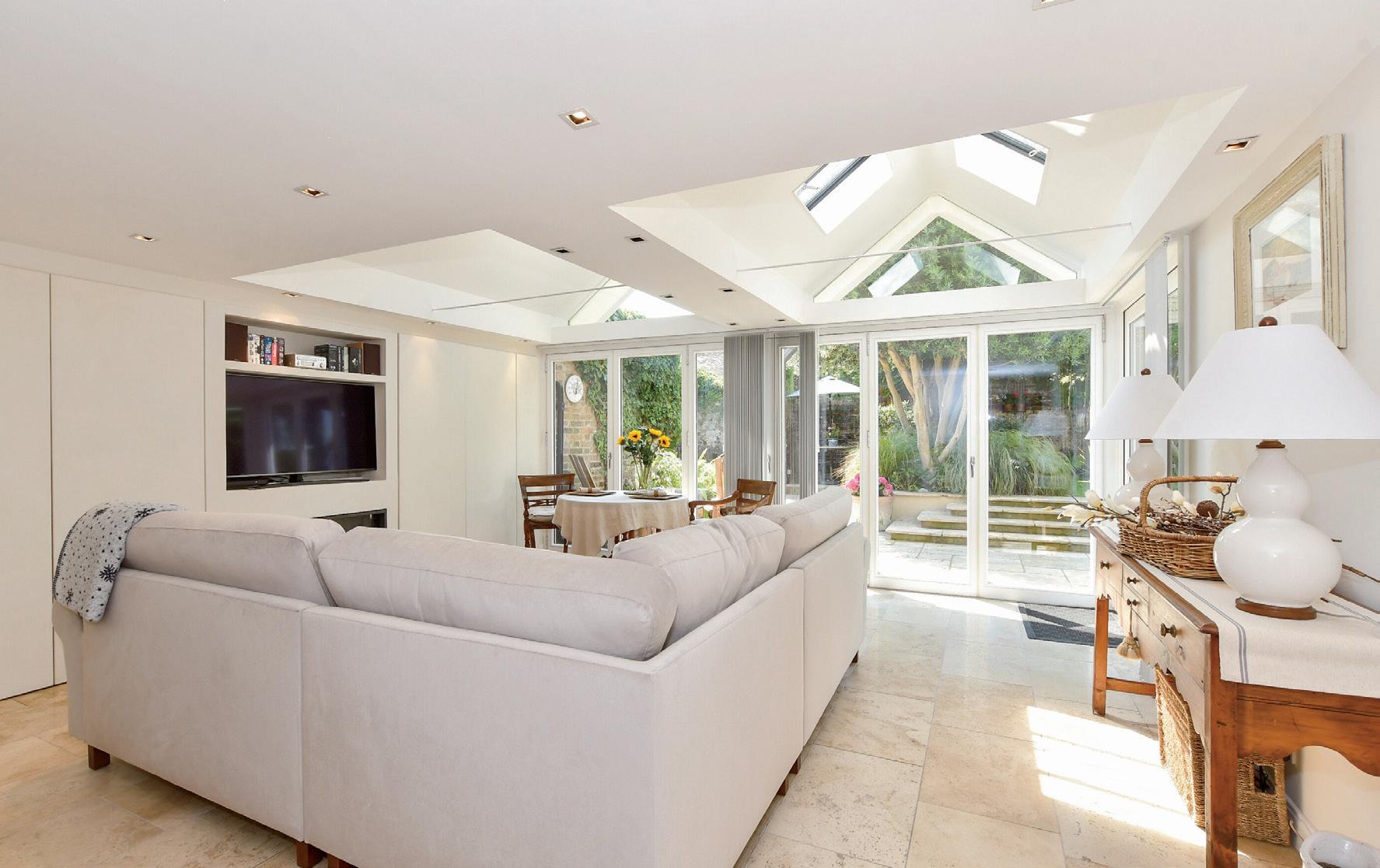 The entrance hall has half height panelled walls, Travertine flooring with underfloor heating that flows through much of the ground floor, access to a cloakroom and a door to the cellar. The cellar makes an excellent storage facility and a place to keep your fine wines. There is an attractive dining room for those more formal occasions that includes an original fireplace with an open fire and sculptured surround as well as fitted shelving and a central painted beam. The elegant drawing room has inset ceiling lights, built in shelving and cupboards, picture rails and high skirting boards that give it such a great character. and is just the place for some ‘quiet’ time. However, the ‘star of the show’ has to be The recently created family room. This has two high vaulted ceilings incorporating skylights, two sets of bi-fold and French doors to the garden adjacent to the dining area and a raised contemporary electric fire as a focal point providing plenty of heat in the seating area. The large kitchen/breakfast space is ideal for anyone who enjoys catering and entertaining. It incorporates a central island/breakfast bar and bespoke solid oak units finished in Farrow & Ball paint housing a variety of high end appliances including a five ring gas hob with a glass backsplash, a built in oven, warming drawer and microwave as well as an integrated dishwasher and American style fridge freezer.