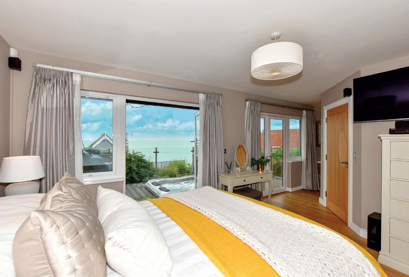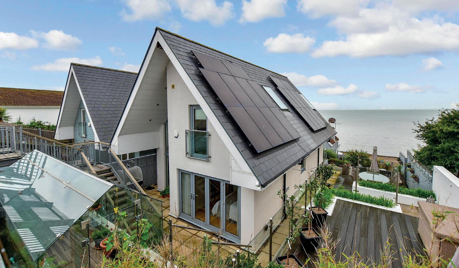 Sea Breeze is an attractive contemporary eco home located on the beach side of Western Esplanade in Hampton, Herne Bay with panoramic sea views reaching across to the Essex coast to the west, and Reculver towers to the east. This coastal property: designed with leisure and pleasure in mind, makes a delightful and unique permanent home or an excellent weekend and holiday retreat. There is a large gravel driveway with parking for multiple cars, and steps down to the front of the property passing the impressive frameless glass greenhouse created by Pure Greenhouse. A glass frontage including a glazed front door, opens into a bright double height entrance hall with a stunning light installation (Scabetti’s ‘Shoal286’ as featured in Coast Magazine). Stairs to the first floor reveal the sea view through a light open plan lounge/kitchen/diner with high vaulted ceilings and a wall of floor to ceiling windows and frameless glass doors. These doors open fully onto a vaulted and covered balcony with a frameless glass balustrade, providing an uninterrupted sea view.