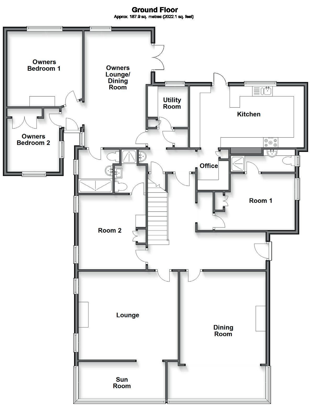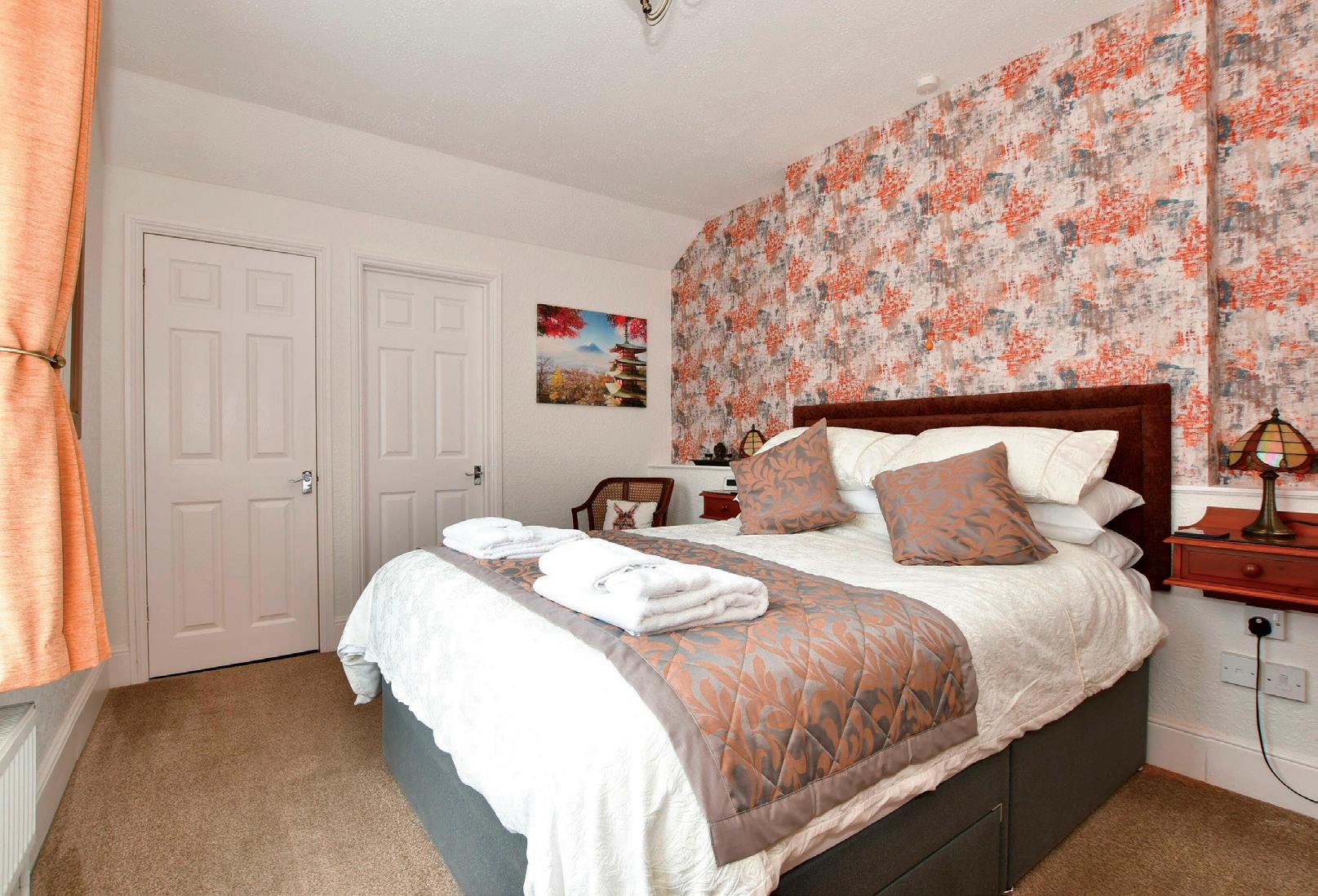 The guest house is set back from the road with a raised front lawn, shrub borders and a low wall flanking the drive that leads to the garage and the front porch with its charming wrought iron feature. The front door opens into the welcoming hall and the first room you come to is the bright and spacious guest dining room with a veritable wall of windows providing plenty of natural light. Next door is the warm and friendly lounge with a delightful cast iron fireplace and white mantlepiece as a focal point as well as open access to the charming sunroom that has French doors to the front garden. Also on the ground floor are two double guest rooms with fitted cupboards and en suite showers that are particularly ideal for guests who find the stairs difficult. The rest of the ground floor is currently designed as the current owners’ domain but obviously this more modern and flexible accommodation could be altered dependent on future requirements. It includes a separate entrance and a relaxing lounge/dining room with patio doors to the lower resin terrace as well as two double bedrooms, a bathroom, office and kitchen with an adjacent utility room. The kitchen provides appropriate facilities as a commercial kitchen for daily breakfasts but also as a ‘family’ kitchen for the rest of the day. It includes a Rangemaster cooker, a separate gas hob, grill and deep fat fryer as well as a hot cupboard to keep plates of food warm, two microwaves, an American fridge freezer, a new commercial dishwasher and a separate raw meat fridge.