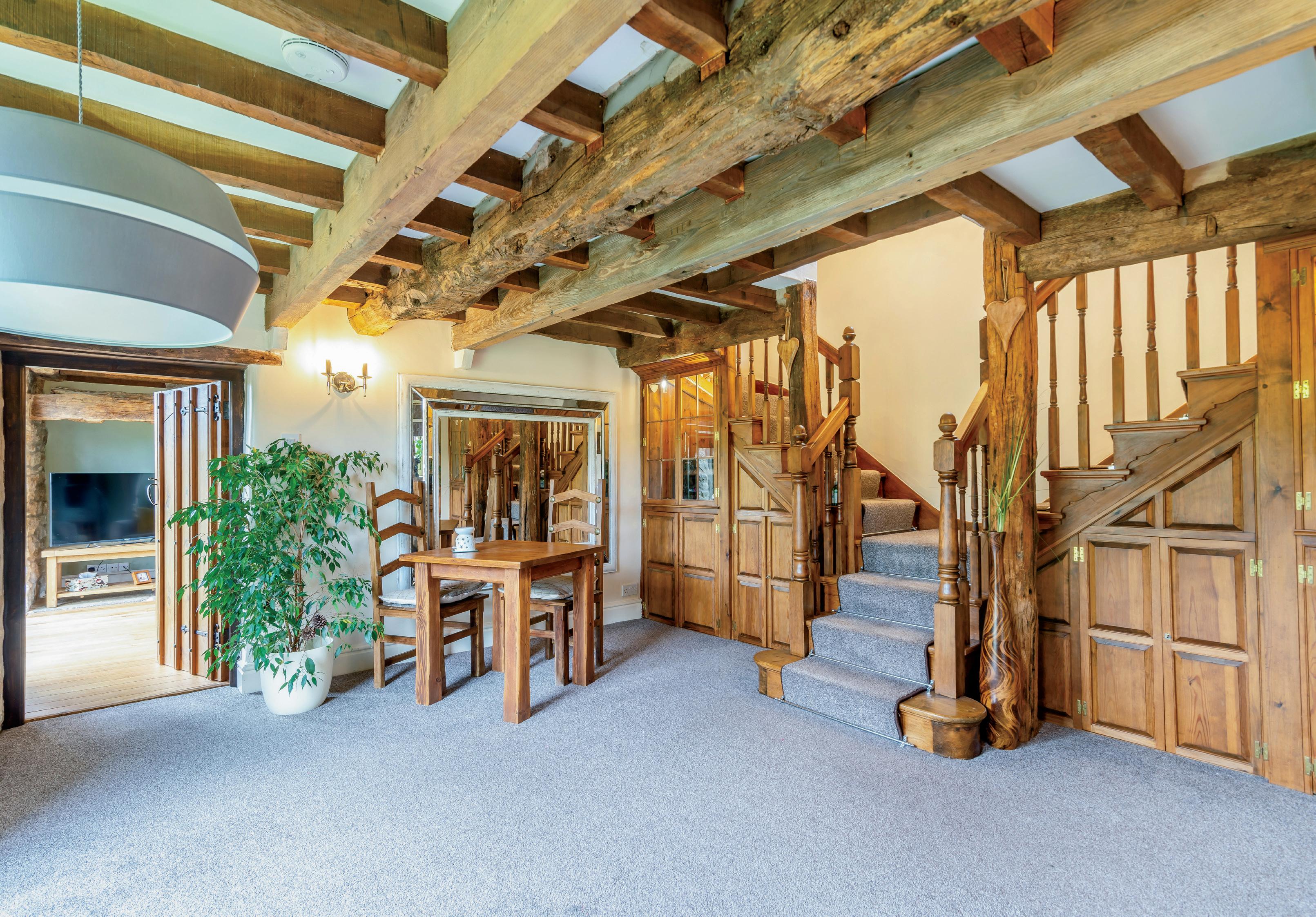 The dining hall offers exceptional proportions, enjoys excellent levels of natural light, has exposed beams to the ceiling, and a stunning two-way oak staircase with original timber supports whilst oak panelling to one wall surrounds two glass fronted display cabinets. An original exposed stone wall has two windows in addition to a full height window overlooking the garden.