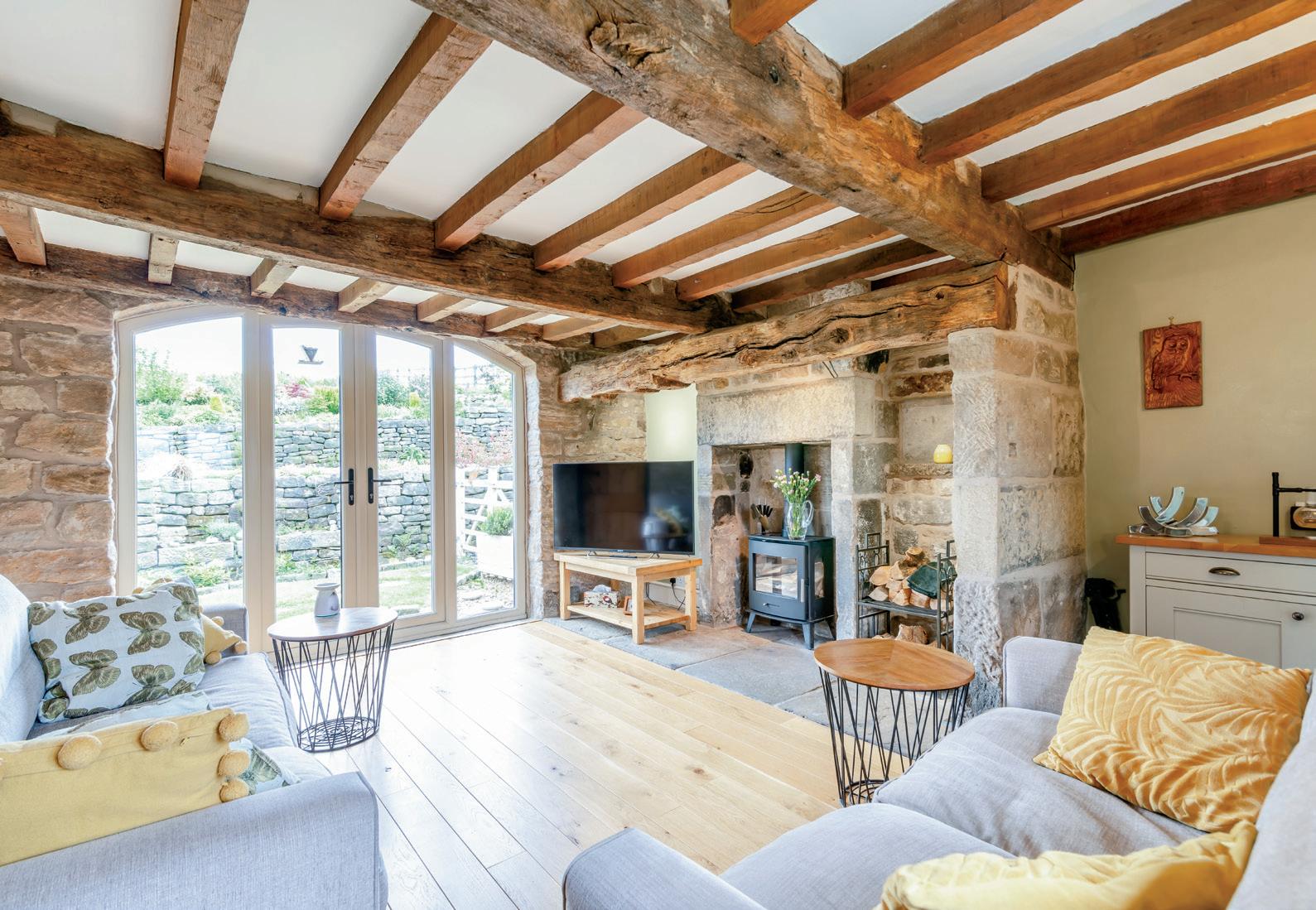 The living room incorporates an Arch top window with French doors opening onto the rear garden, whilst an additional window commands views across the valley to the front. There are exposed beams to the ceiling, original stonework to two walls, an oak floor and a beautiful Inglenook fireplace with an original beamed lintel over, with a wood burning stove that sits on a stone flagged hearth.