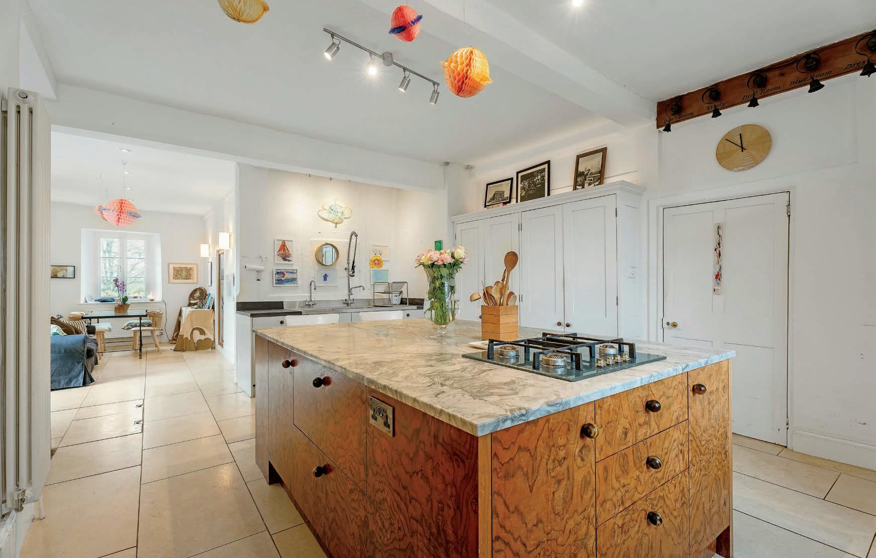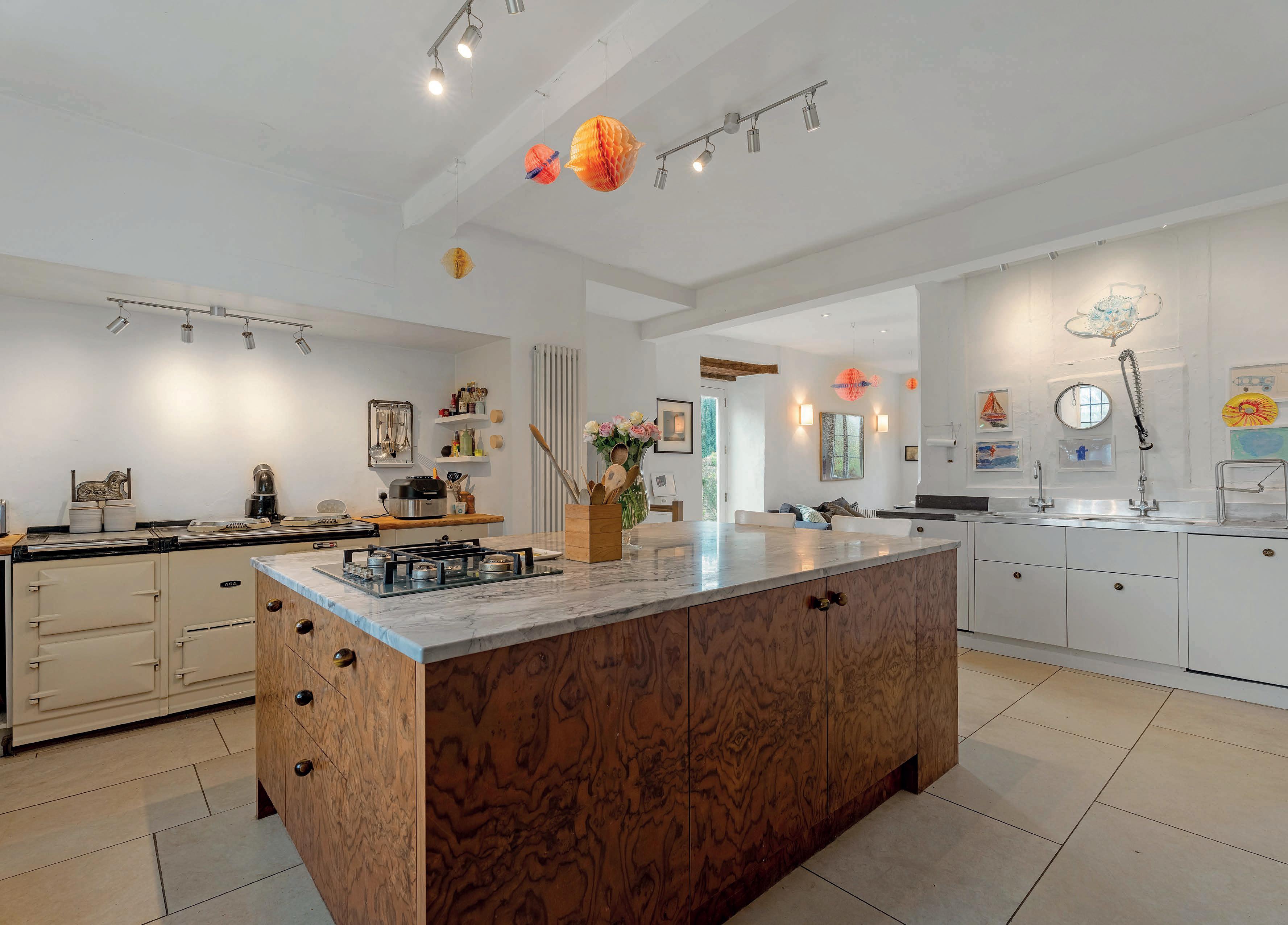 Within the house itself, the kitchen island is made from walnut burr on top of which sits a magnificent and very rare slab of Bianco Eclipsia - a white/grey marble with grey semi translucent veining of exceptional quality and durability, originating from Brazil. Semi-precious tiger’s eye spheres serve as cabinet knobs. The island is designed to contain pots and pans, cookery books and equipment, leaving lots of free wall space for paintings, floating shelves to display flowers in vases, or pretty objects.
