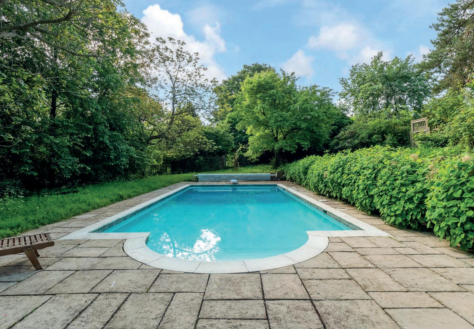 The swimming pool area is quite simply like no other place I’ve ever been. Through the pool gate, a few stone steps lead down to a terrace, with three more stone steps to the pool, so it’s enclosed and sheltered. As the pool faces south-west, the Scots pine in the garden above gives it welcome shade at various times of the day. The space is stunning with its beautiful exotic Catalpa trees, silver birch and fig. The tiled swimming pool sits within an ornamental garden and has Roman steps leading down into it. White Annabelle hydrangeas run along one side, that when reflected in the blue sky of the pool look simply beautiful.