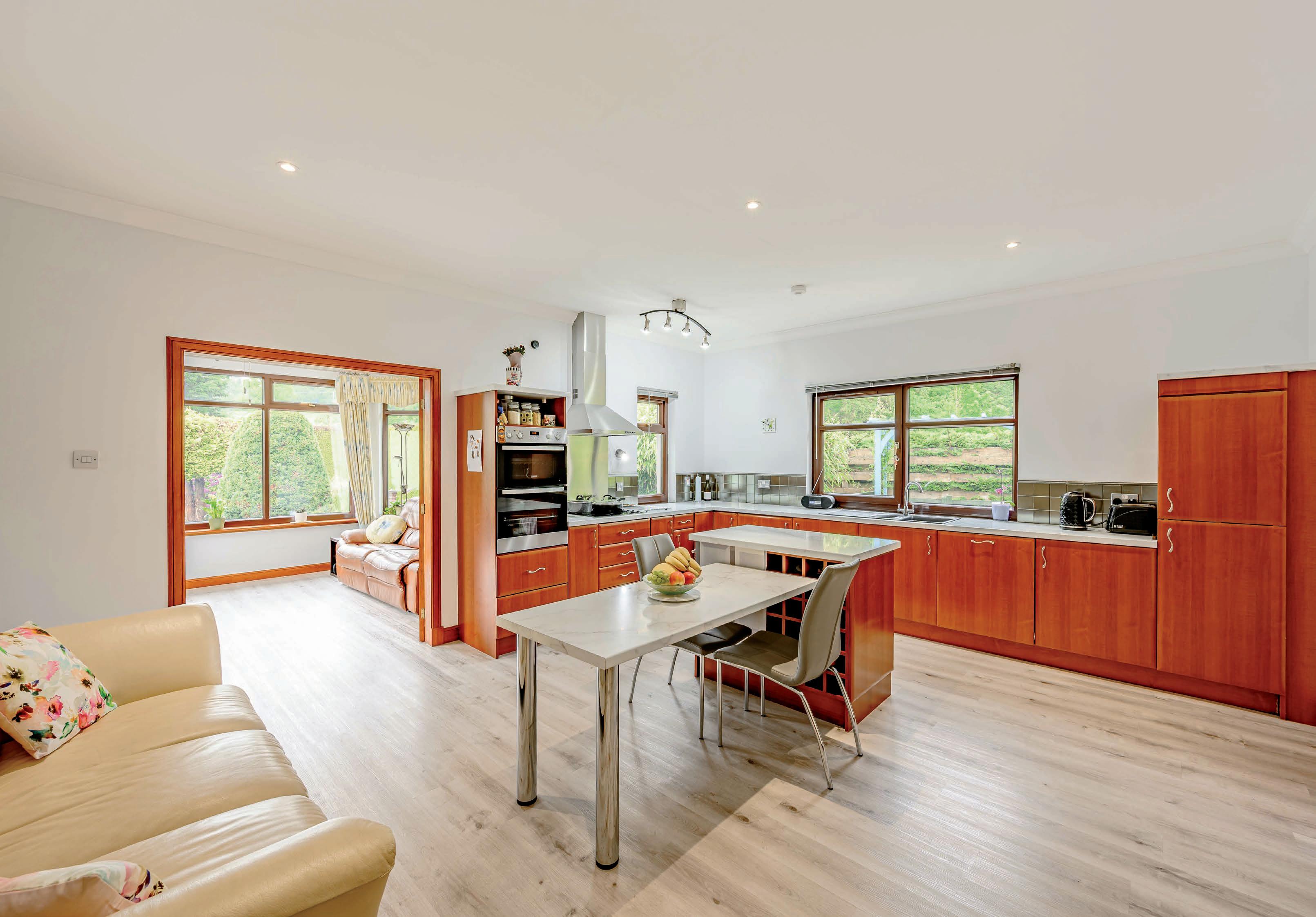The front door opens into a tiled vestibule, which in turn leads into a generous reception hall. Three steps down from the hall is a roomy dining hall, with 10 ½ ft high ceilings: an ideal entertaining space. Double, glazed doors lead through to the spacious sitting room, which enjoys a dual aspect, high ceilings and an 8kw multifuel stove set into a slate surround.