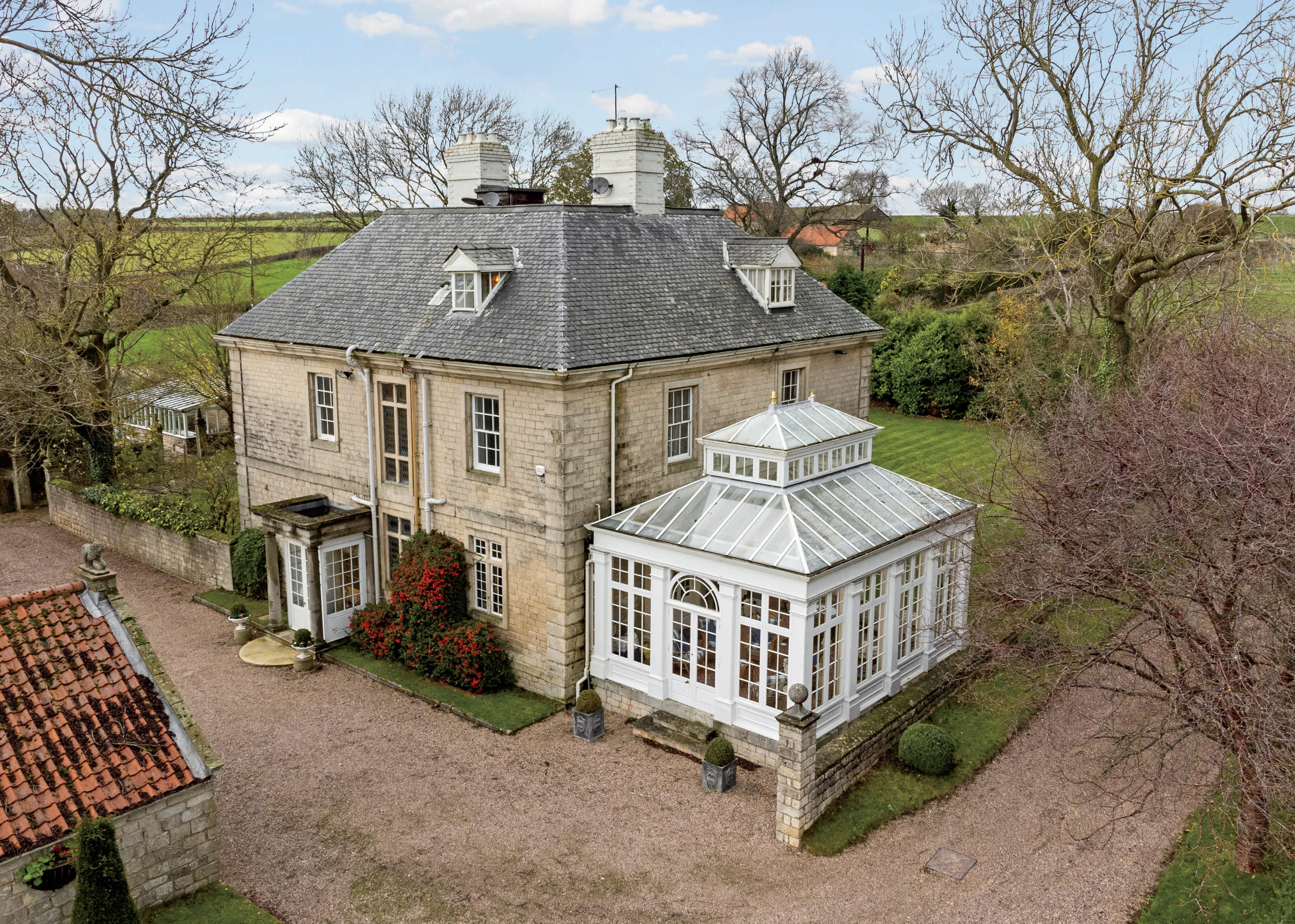 Formal living accommodation including the drawing room and dining room are positioned to the rear of the hallway and occupy a north facing aspect, commanding pleasant views over the house gardens and showcase exquisite features including sash windows with stone sills commanding an inspiring outlook over the grounds, feature parquet flooring, bolectionmoulded stone fireplace, dado rail and feature frieze to the ceiling and deep skirting boards. The sitting room and living kitchen are positioned on either side of the hallway, both enjoying a stunning outlook over the grounds and adjoining countryside. The sitting room has French doors through to the orangery, which is flooded with natural light and has a Herringbone tiled floor and views over all aspects of the grounds.