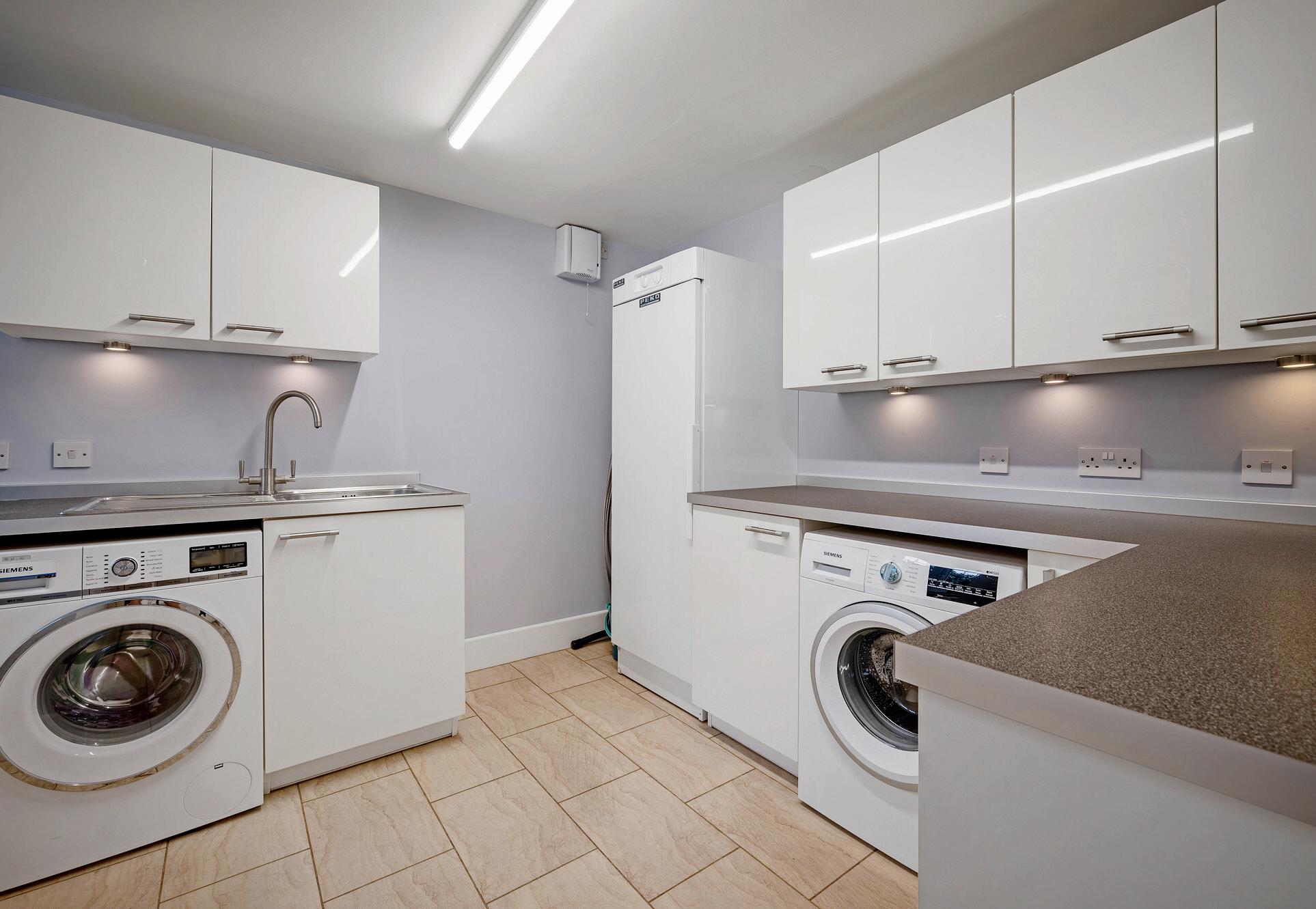 The adjacent laundry room is equipped with an extensive range of wall and floor-mounted cabinets, along with two washing machines, two tumble driers, and an excellent Peko drying cabinet. Additionally, the boot room provides access to the large boiler room, a second guest WC, a second front entrance/ passageway/annexe entrance, and an integrated double garage.