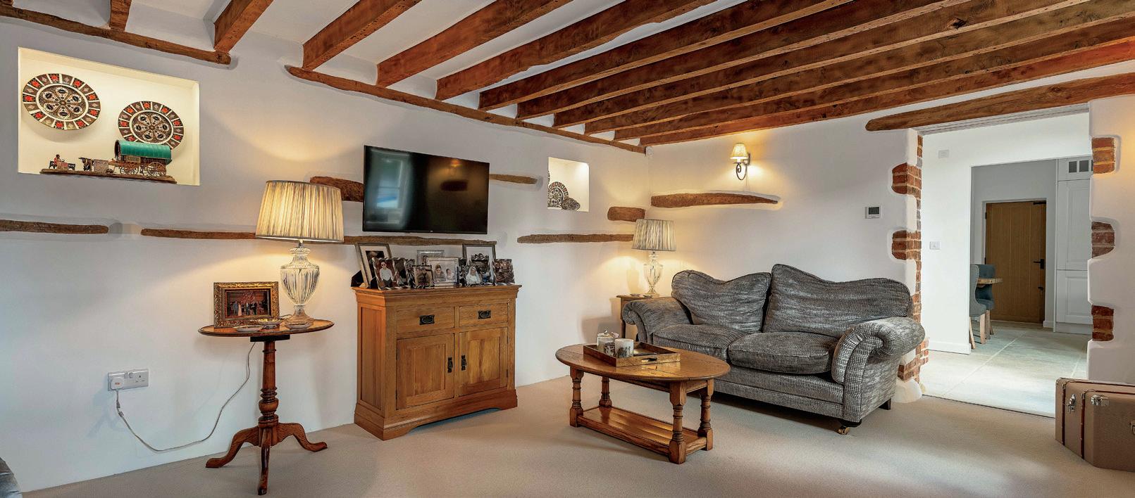 The main bedroom suite combines rustic charm including exposed timber beams that add character and warmth. The beams contrast beautifully with the crisp, white walls, which are accented by thoughtfully placed stone inserts, enhancing the room’s historical charm. It also boasts an exquisite en-suite which is a meticulously designed space featuring a walk-in shower, complete with a luxurious rain showerhead and sleek glass enclosure. The pristine white tiles and polished brass fixtures exude sophistication, while the wooden beam accent adds a touch of rustic elegance. The vanity area is thoughtfully equipped with a chic pink vanity unit topped with a pristine white basin, complemented by a generously sized mirror and flanked by modern wall sconces that provide ample lighting.