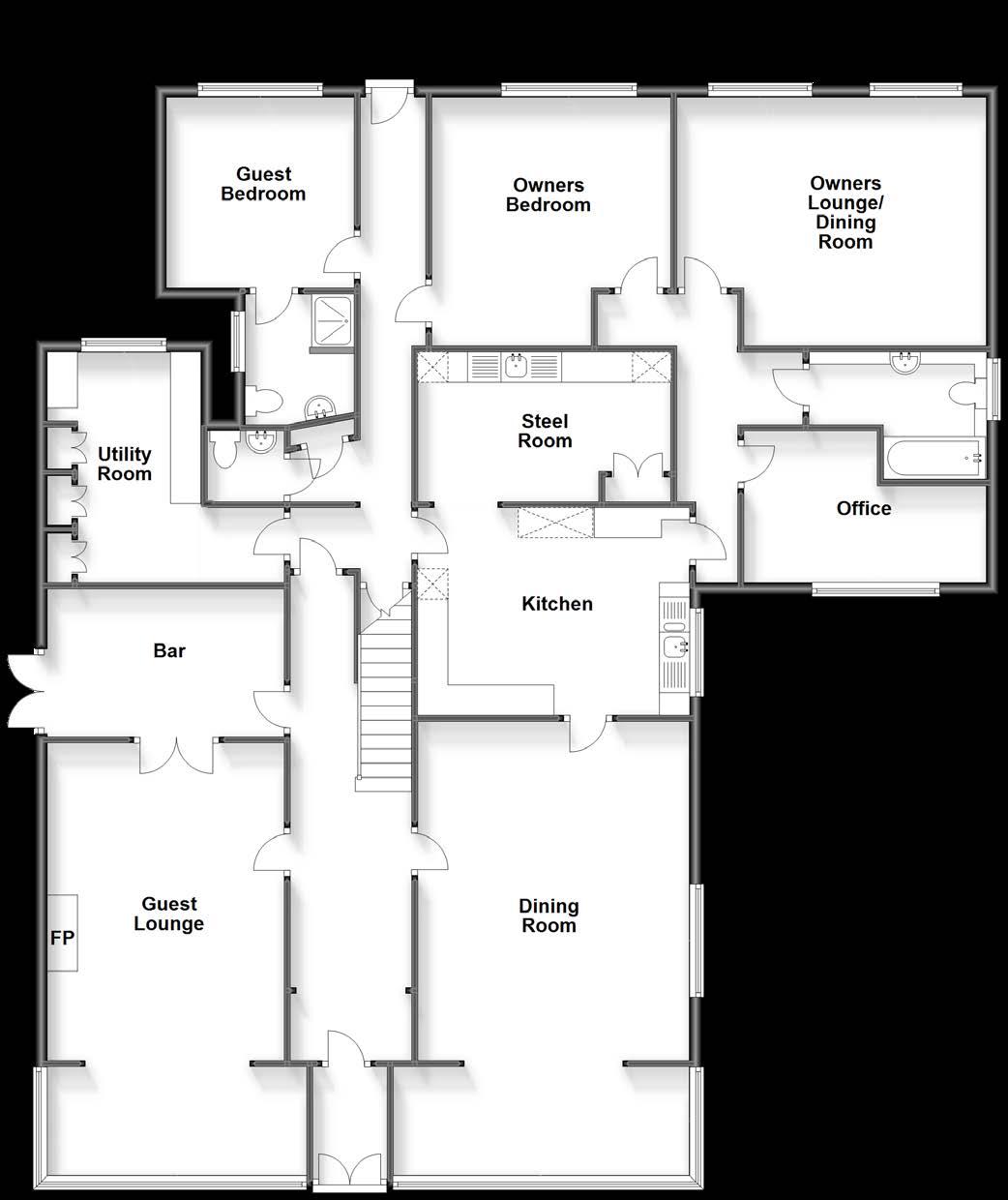 This floor also includes one double guest suite with access to the garden while the rest of the ground floor provides facilities for the owners. There is the owners’ double bedroom, lounge/dining room, bathroom and office as well as a spacious utility room with four washer/ dryers, a back door to the garden and the large kitchen that opens into the guest dining room. The kitchen includes a large food preparation area known as the ‘steel room’ and the main kitchen with its large range cooker, microwaves and plenty of storage as well as fridges, freezers, dishwasher and a stainless steel topped central ‘island’.