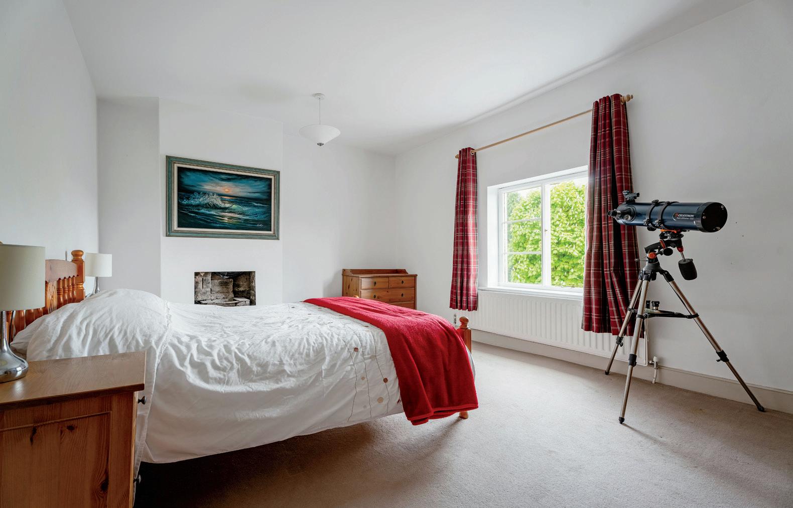 Ground Floor: The grand front door leads to an entrance hallway with built-in storage. The formal dining room features an elegant stone fireplace and woodburner, along with reclaimed Oak/Elm flooring, flowing into a central hallway with access to the vaulted cellars and a guest cloakroom/WC. The formal sitting room has dual aspect sash windows, a log burner, and underfloor central heating. The heart of the home is the open plan kitchen, dining, and living room with a large walk-in Inglenook fireplace, contemporary kitchen with a free standing island, with dual aspect windows showcasing countryside views.