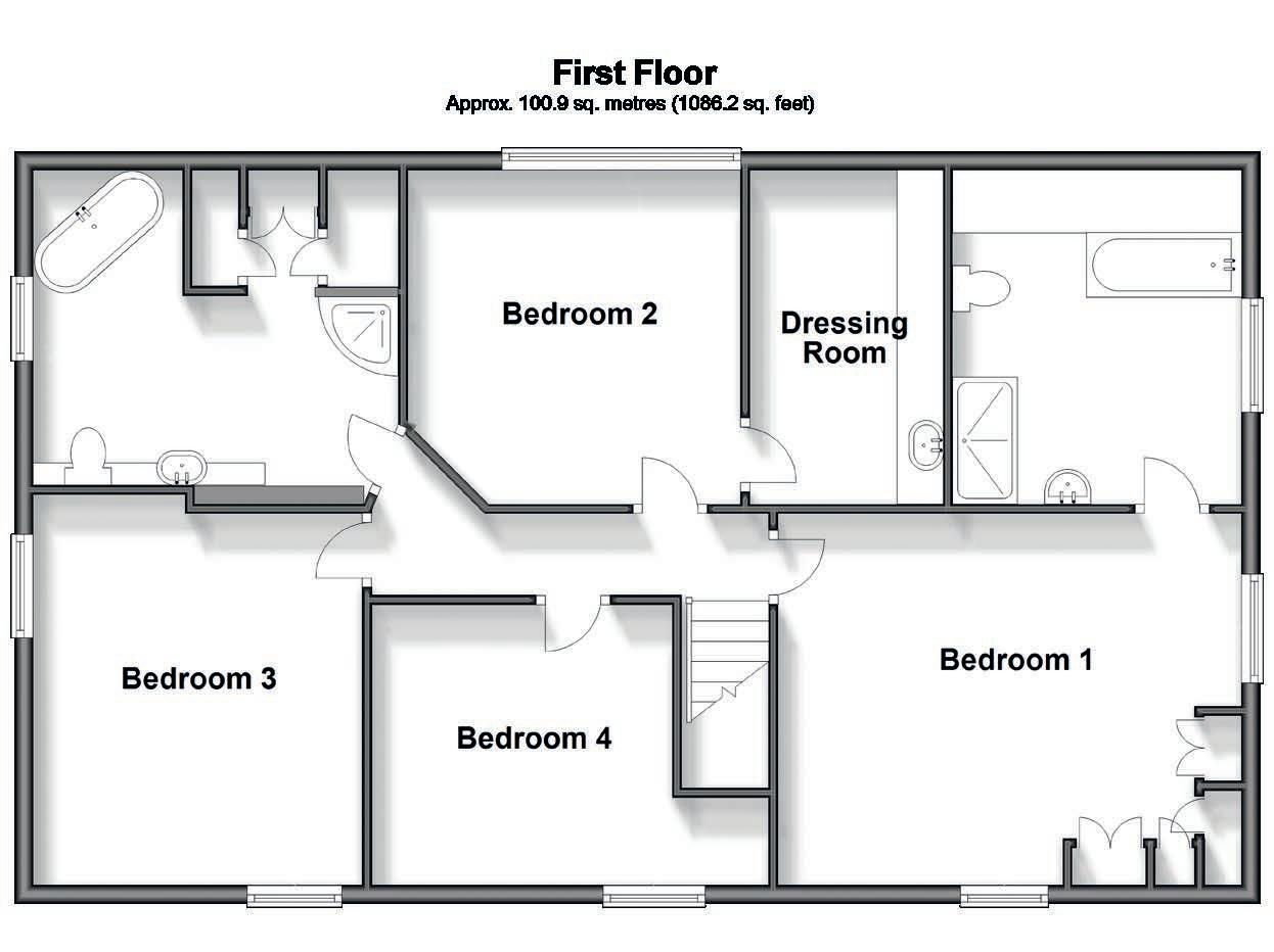 To the first floor are four well-proportioned double bedrooms, with the principle benefitting from a sizeable ensuite bathroom boasting a bathtub as well as separate double shower enclosure. The second bedroom enjoys its own dressing room complete with a sink, indicating the potential to fit an ensuite here with relative ease. The remaining bedrooms share a huge, contemporary family bathroom with a luxurious, freestanding bathtub, as well as double sized shower cubicle.