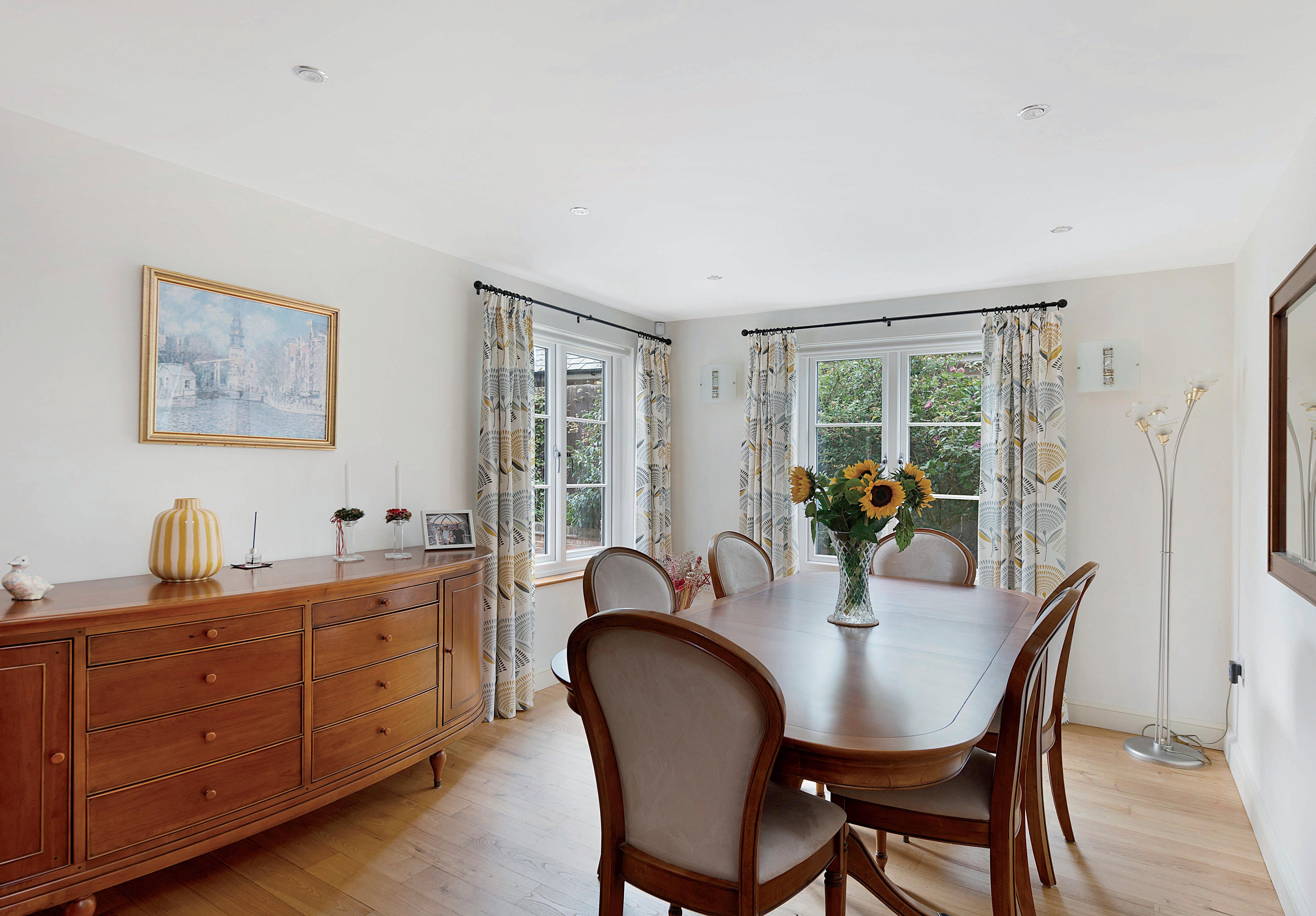 Upstairs, the five bedrooms are well served by two en-suites and a family bathroom. The principal bedroom benefits from built-in wardrobes and garden views.
