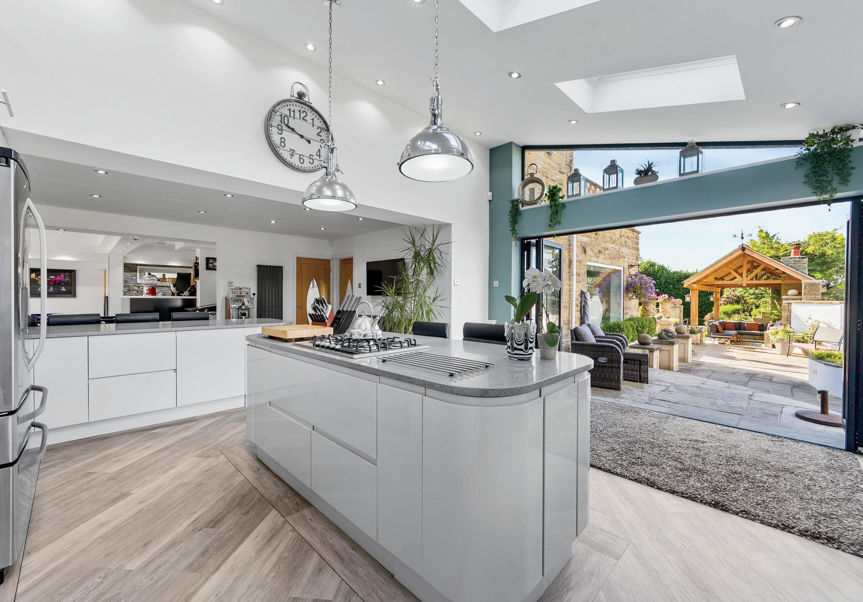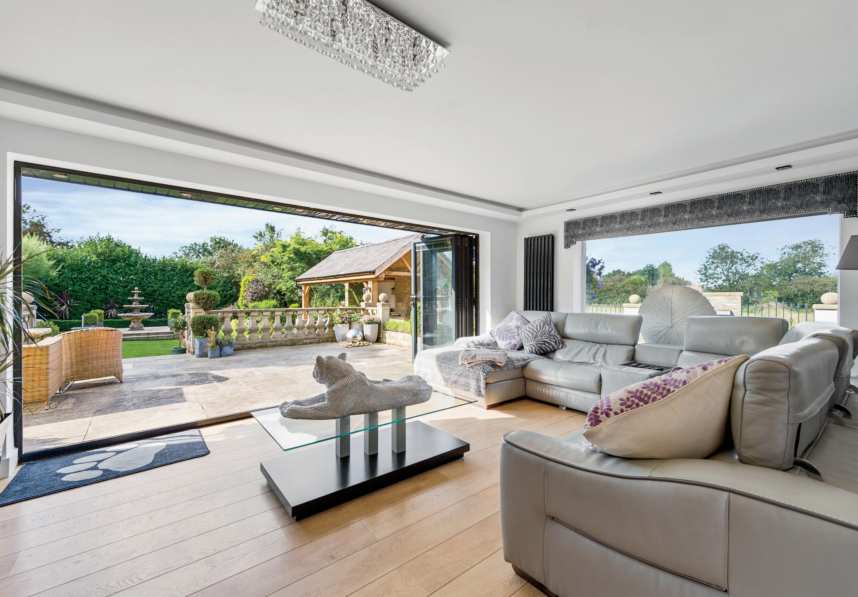 Step inside, and you are greeted by a sense of grandeur and openness. The spacious open-plan living area is the heart of the home, designed to foster a seamless flow between the kitchen, dining, and lounge spaces. Natural light cascades through large bi-fold doors, illuminating the room and creating an inviting atmosphere and a sense of space, while carefully chosen lighting fixtures add a touch of elegance and warmth.
