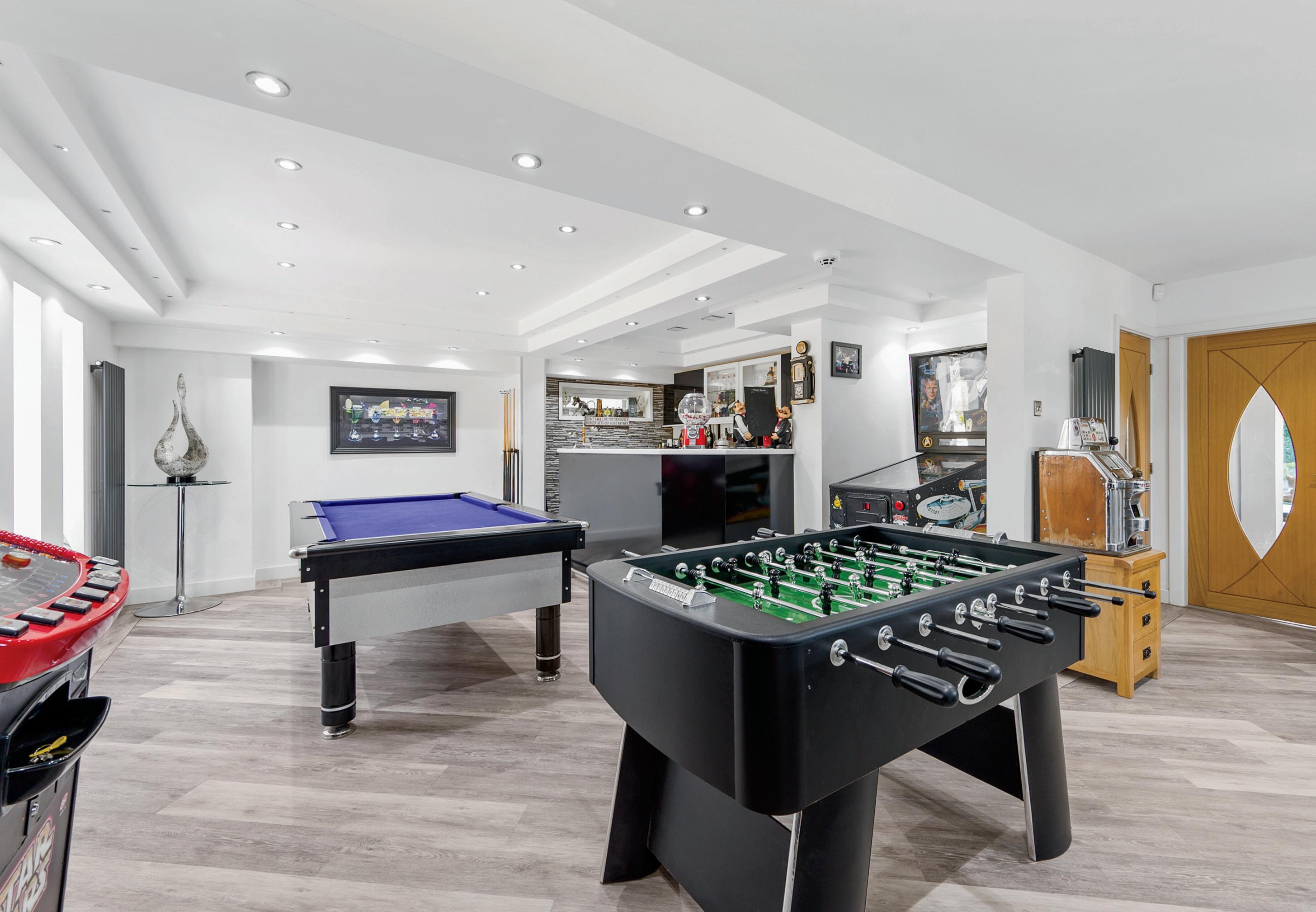 The kitchen is a chef’s dream, featuring top-of-the-line appliances, ample storage, and a sleek, modern design. It is perfect for hosting gatherings and preparing culinary delights. A large games room/bar seamlessly integrates into the kitchen, providing a welcoming space to enjoy time with family and friends. The adjacent lounge area offers a cozy retreat, ideal for relaxation and entertainment that gives a stunning aspect across the rear garden.