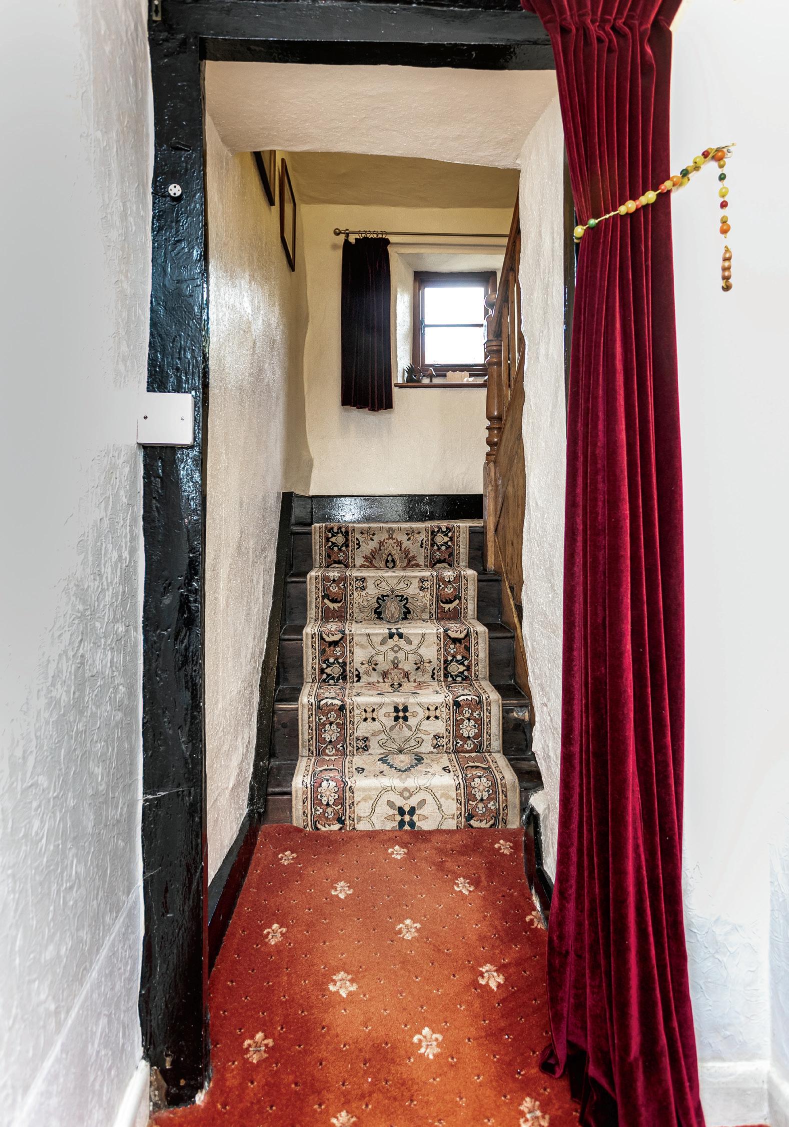 The kitchen gets the morning sun and has a dual aspect out to the gardens and barn. The two sitting rooms both have Morso stoves and are warm and cosy. In one sits an oak court cupboard carved “WJ 1716” – it’s part of the history of the house and has been passed through successive owners, it will stay with Hazel Hall when it sells. On the practical side of things the ground floor has a utility room, wet room and separate loo. A charming staircase leads to the first floor, alighting to the landing with plenty of exposed woodwork; beams, boarded doors and old oak floor boards. There are three double bedrooms and two singles. All have got unspoilt views in one direction or another. Certainly no need for curtains here if you don’t want to – there’s not a chance of being overlooked! The house is larger on the first floor as the third double was a former hayloft built into the banking and long since converted. The bathroom has a three piece white suite and good storage.