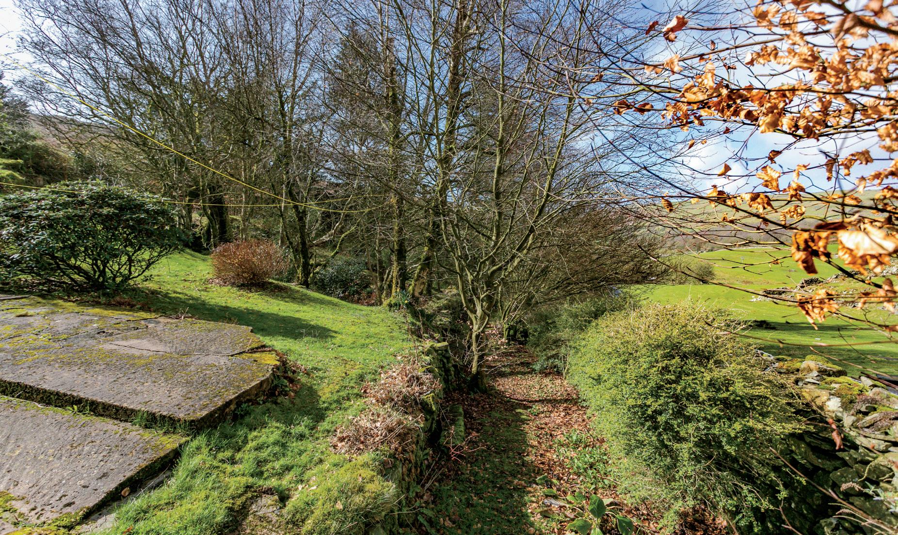 The garden is virtually a small arboretum with beech, birch, larch, spruce, sycamore, oak, hazel, hawthorn, and a thuja.. A staghorn sumac puts on a colourful show as do the flowering shrubs with hydrangea and rhododendrons, mature heathers, elderflower and flowering currant bushes. The garden is delightfully informal, rather than lawns, there are areas of grass, the garden as a whole naturally breaks into distinct areas formed by the lie of the land, the rocky outcrops, positions of the buildings or the route of the stream and waterfall. There are planted borders nearer the house, a flagged seating area, and drifts of wild daffodils to herald in spring. Over in the vegetable garden approached across a slate bridge which straddles the stream there are five beds which over the years have been productive for the family. They do well with blackcurrants and there are both cooking and eating apple trees.