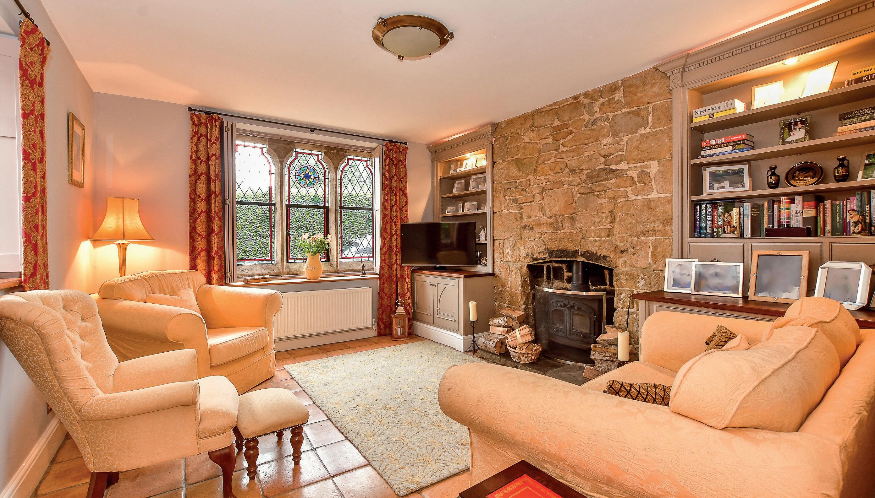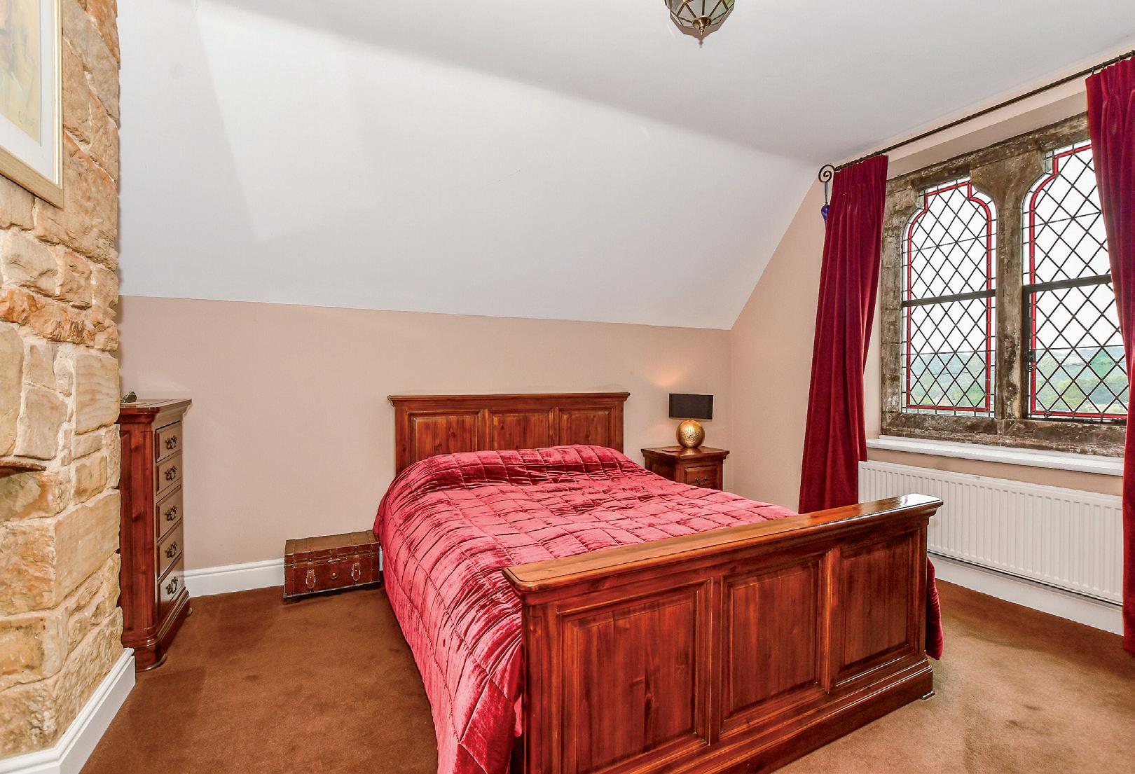 The stairs with their ornate newel posts lead up to the armorial stained glass window and on to the galleried landing with access to a simply stunning contemporary family bathroom with storage cupboards, an impressive slate tiled wall, a separate shower and a central stand-alone slipper bath where you can lie and watch the sun shining through the colourful windows. This bathroom serves two double bedrooms with partially vaulted ceilings including one with fitted cupboards and a stone wall and the master that has panoramic countryside views you can enjoy through the leaded light windows, a stone wall and chimney breast as well as a fireplace.