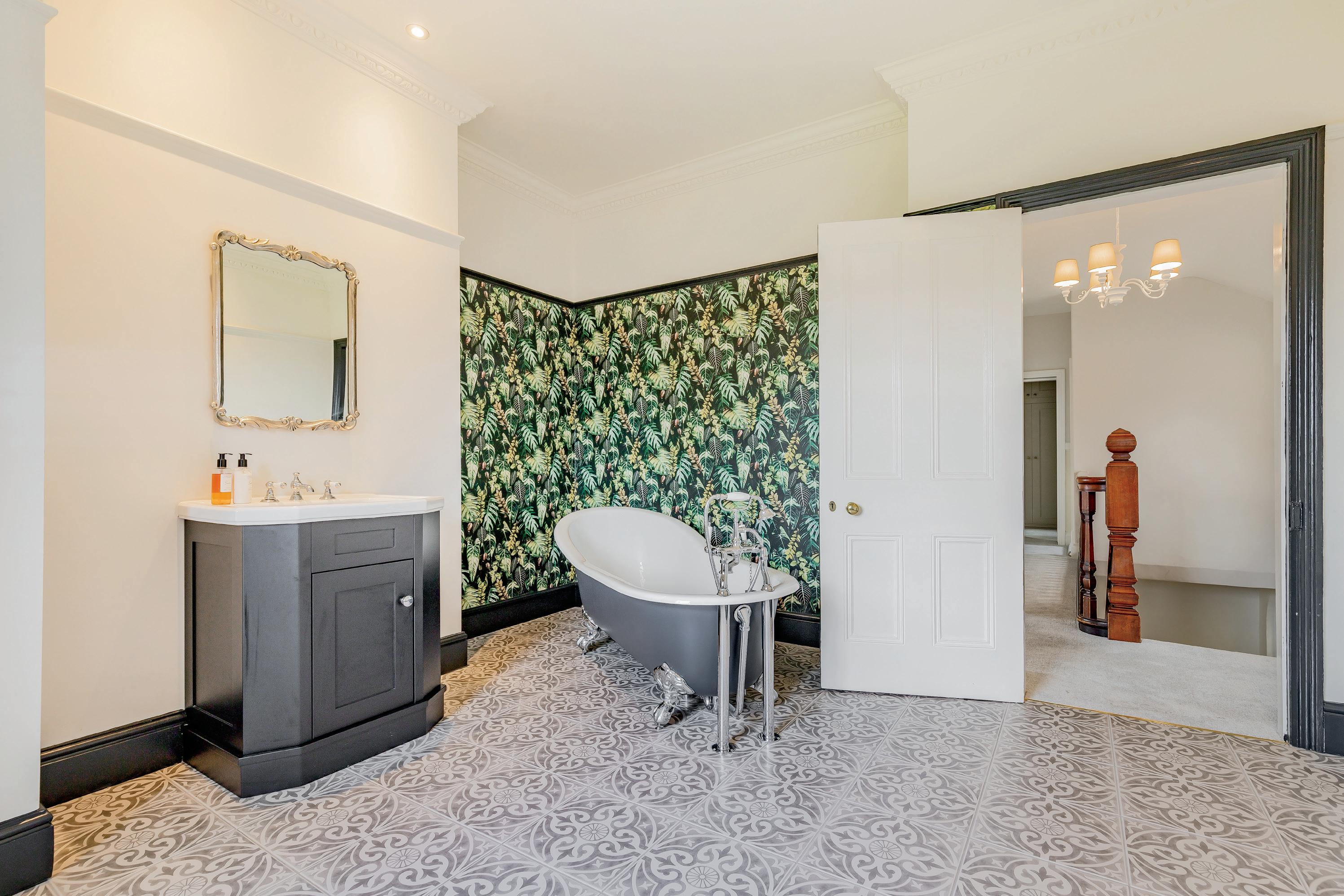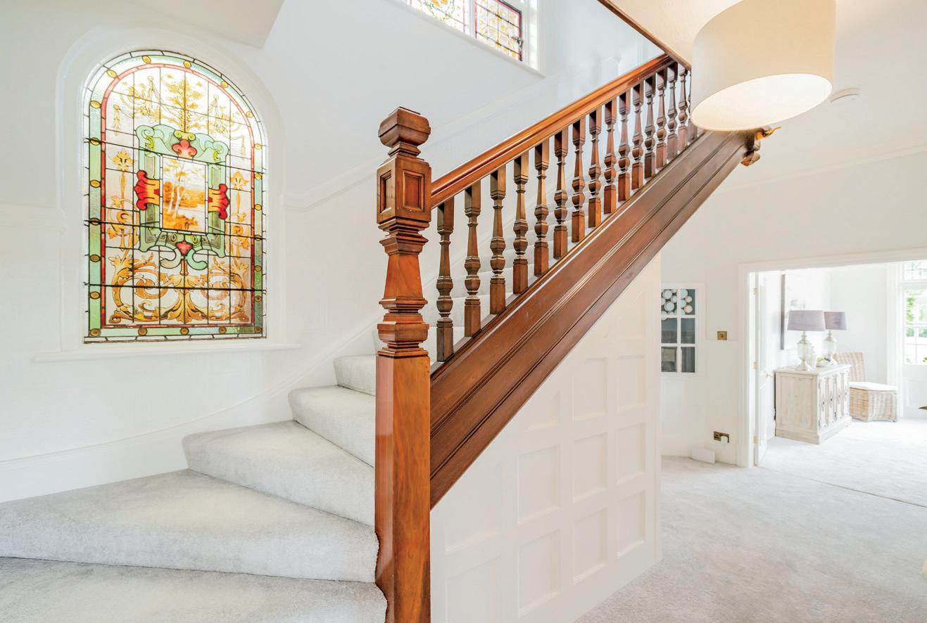 The first floor is accessed via the impressive wooden staircase which is a feature in its own right with stained glass windows leading to the first-floor landing adding to the character of the home. There are five bedrooms, all of which are comfortable double rooms and 4 which have access to en-suite facilities with the family bathroom having a jack and jill facility. The rooms are all neutrally decorated and presented to a high standard and perfect for modern family requirements. Off the landing a door to the extensive balcony can be accessed and an ideal seating area to overlook the front gardens.
