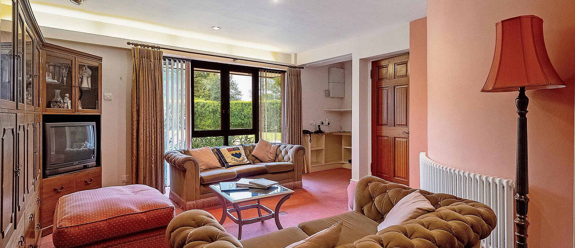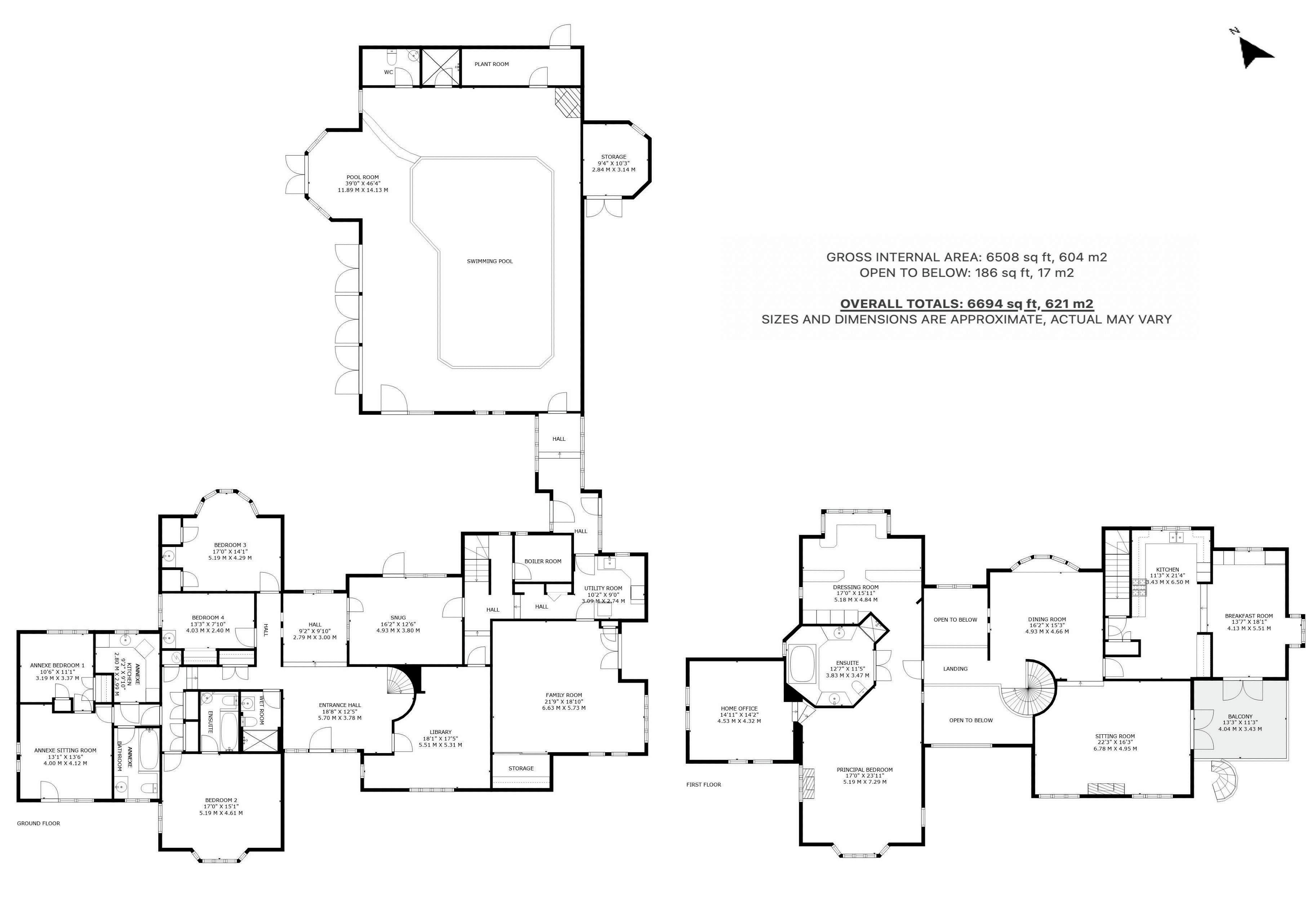 The ground floor offers a family room with air conditioning unit which could also serve as a home gym. There is a library, snug, and utility room, two bedrooms (one with en-suite bathroom), an office/bedroom, access to the pool complex featuring a swimming pool with a depth of 8ft in the deep end, self-contained annexe, and a wet room.