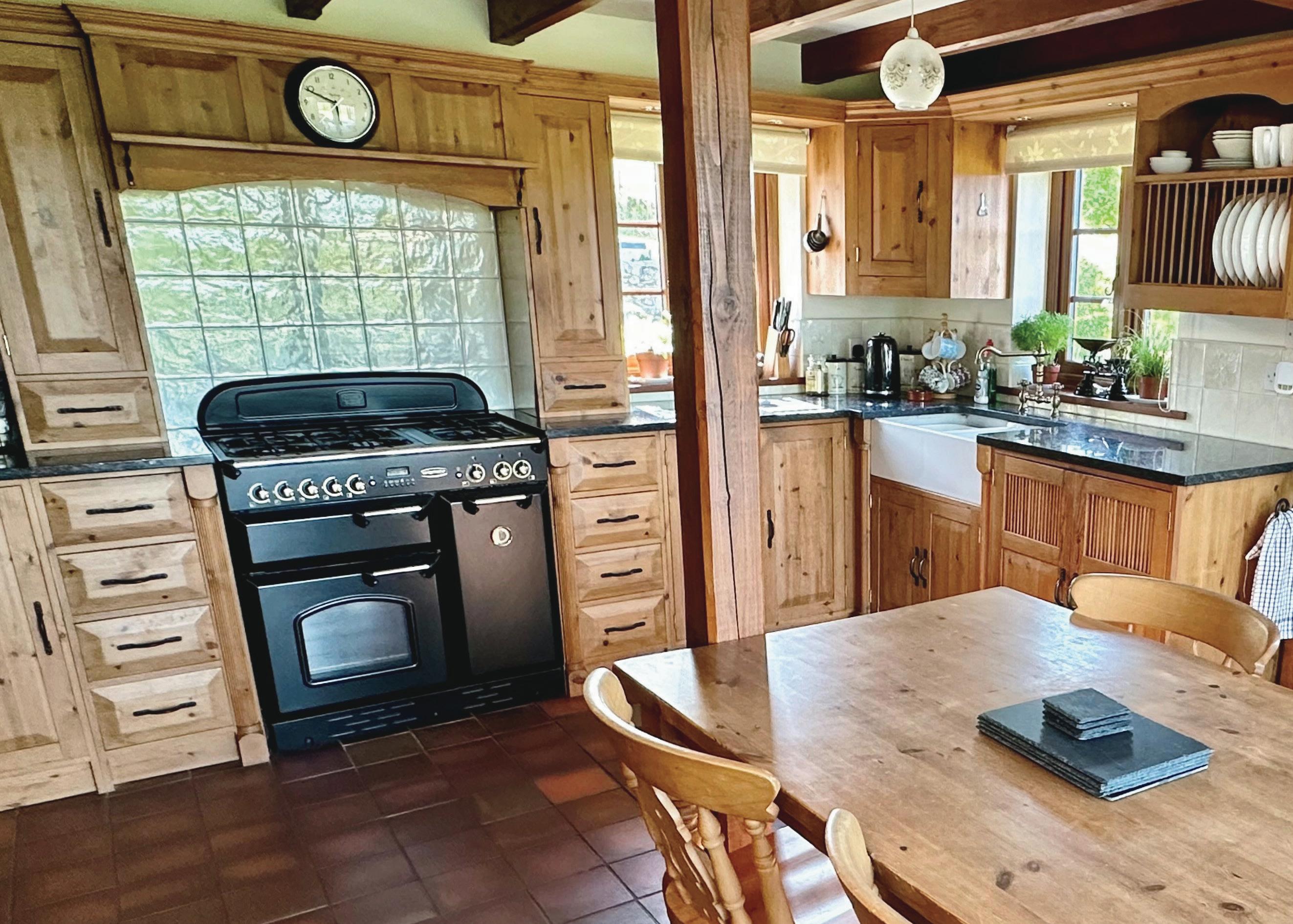 Kitchen Dining Room: Stunning far reaching views, a range of wall and base units, Rangemaster cooker with extractor over, double sink, space for fridge, tiled floor, exposed timbers.