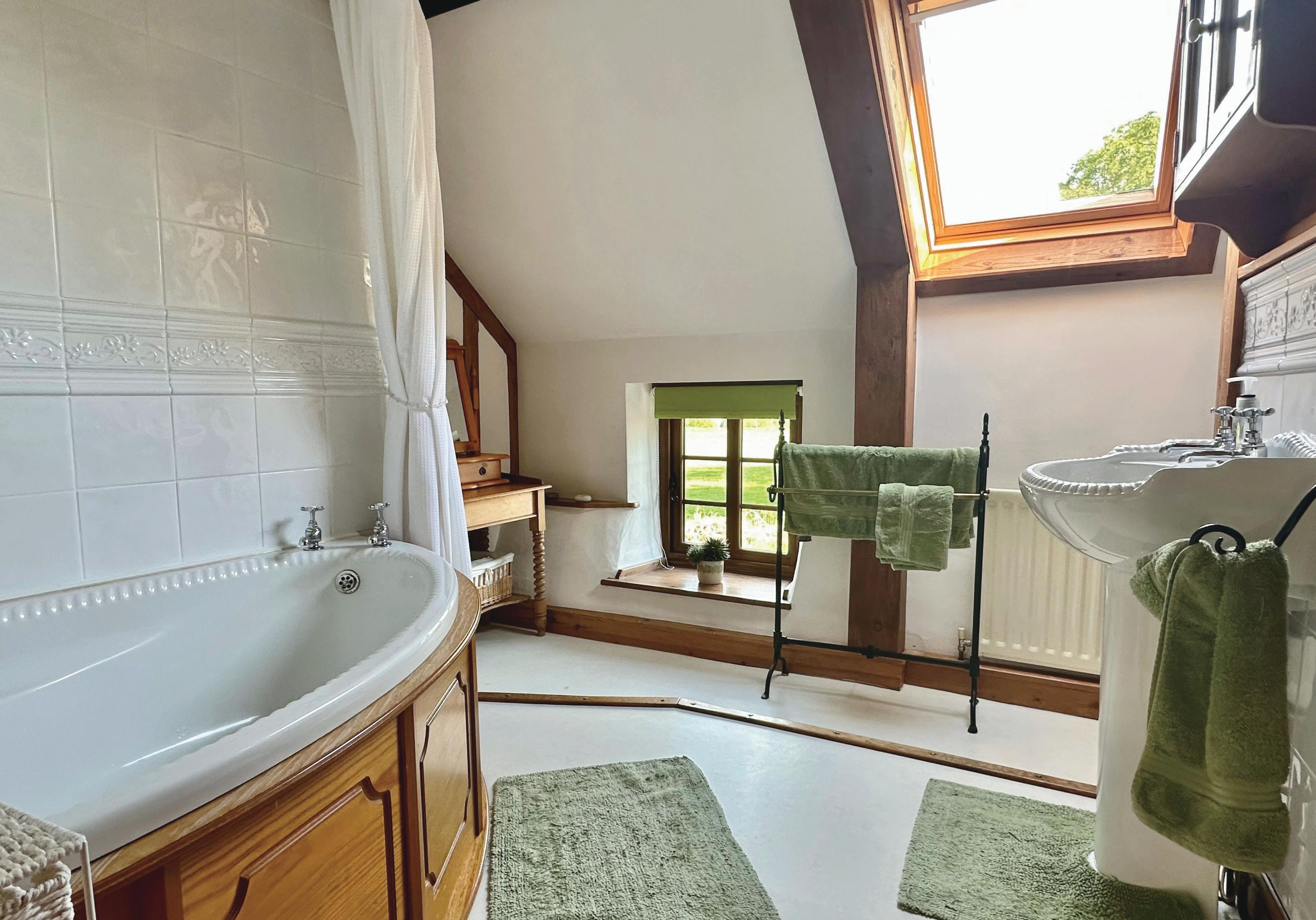 Bathroom: WC, wash basin, corner bath with wall mounted shower over, radiator, exposed timbers, countryside views.