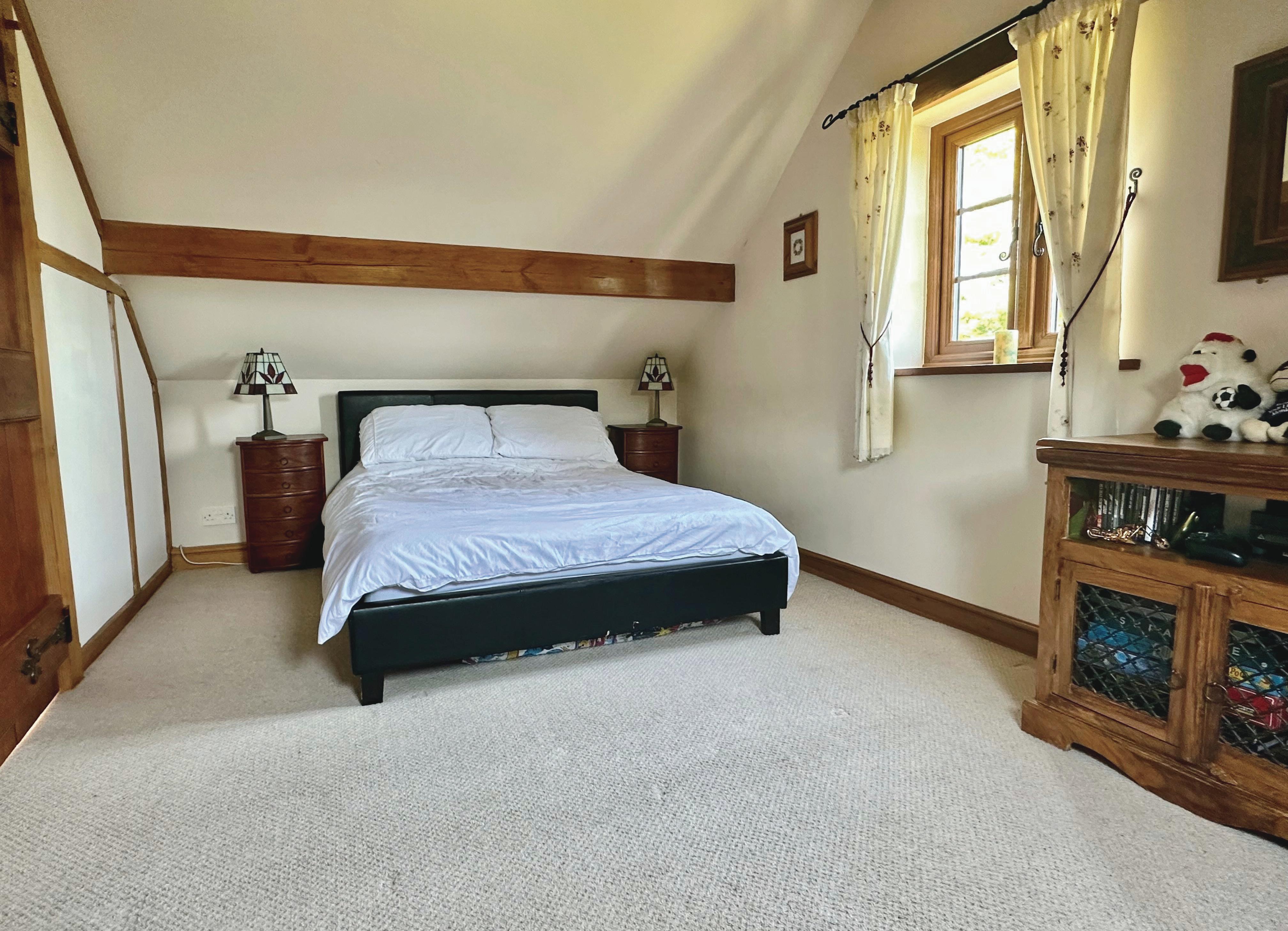 Bedroom One: Exposed timbers, countryside views, loft access, radiator.