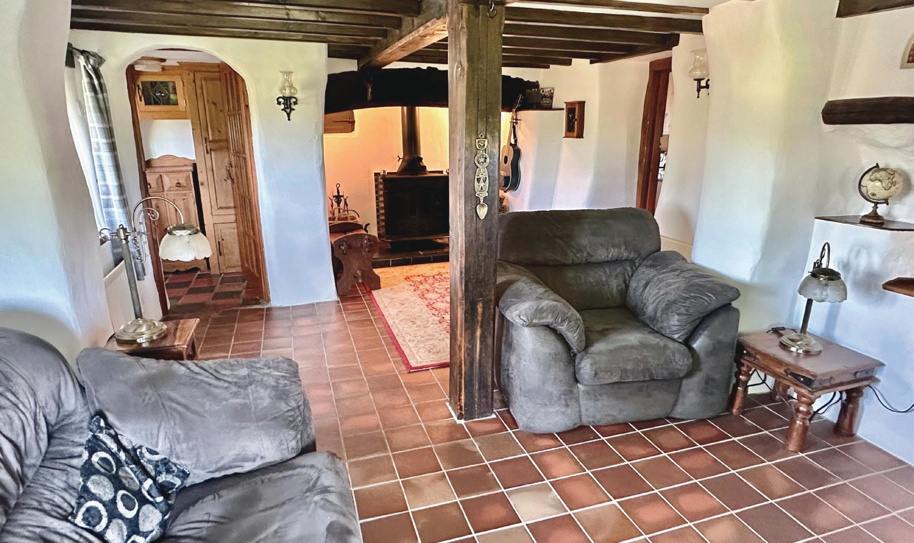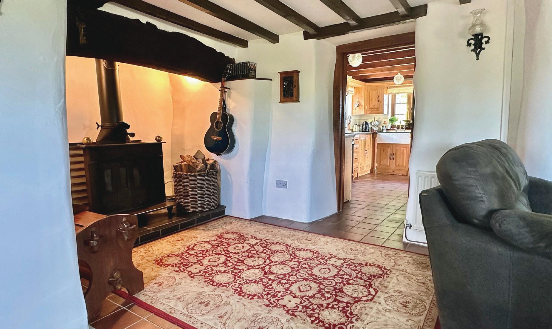 Living Room: Feature fireplace with wood burning stove, exposed timbers, magnificent far reaching views, tiled floor, radiator.