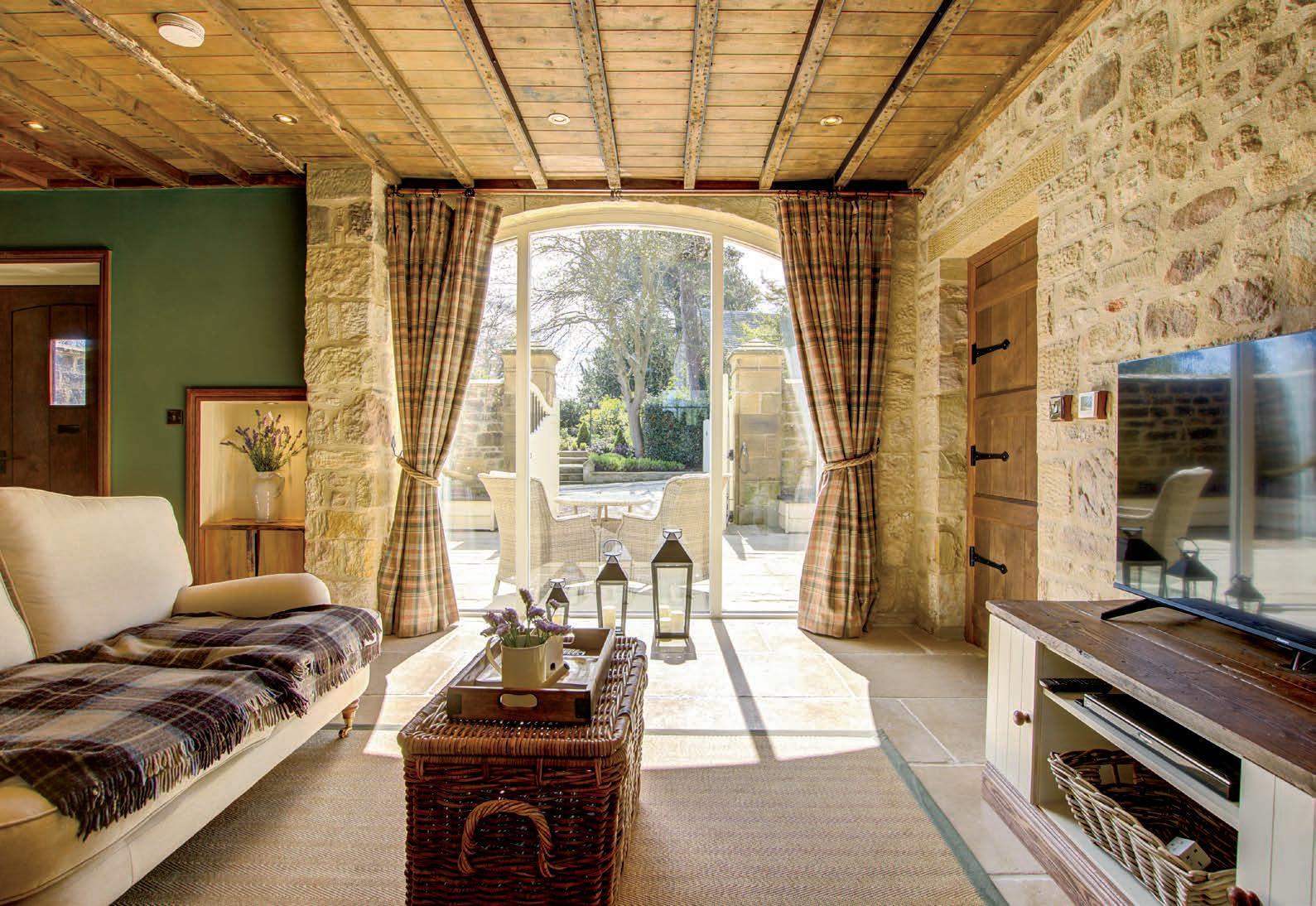 The charming Coach House, recently renovated to perfection, emerges as a haven of comfort and character, thoughtfully crafted from a former coach house and stables. With underfloor heating throughout the property, the ground floor has stone-flagged floors that echo the building’s rustic charm and harmonise with exposed stone feature walls. The original arched barn entrances have been ingeniously repurposed into a glazed entrance hall and a magnificent picture window gracing the sitting room.