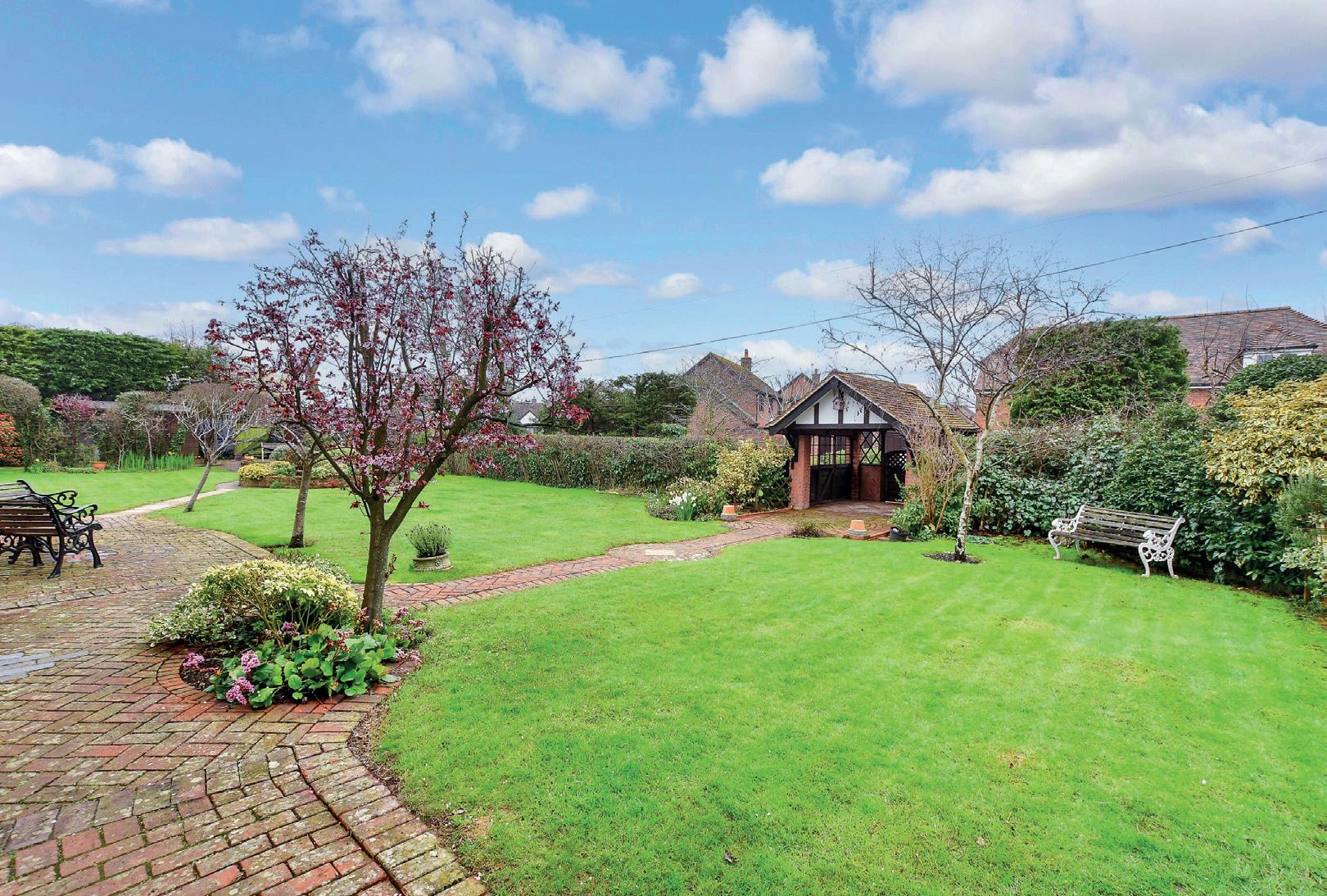 As well as a pathway entrance via the lychgate there is also access to a large driveway where you can park a number of vehicles and the former garage/log store that is ideal for bicycles, motor bikes and a ride on mower. The drive is bordered by beautifully manicured lawns that wraparound much of the property and include delightful brick surround flower and shrub beds, mature trees and a lovely large terrace for al fresco dining. The secluded garden is totally enclosed so is very safe for children and pets and paved paths wind round the greenhouse and lead to two garden storage sheds, a gate that opens onto The Leas private road with access to delightful places to go for a walk. There is also a discreetly hidden gravel area for bins and a gate to a grassy area with trees leading back to the lychgate hidden by high hedging and providing additional privacy from the road.