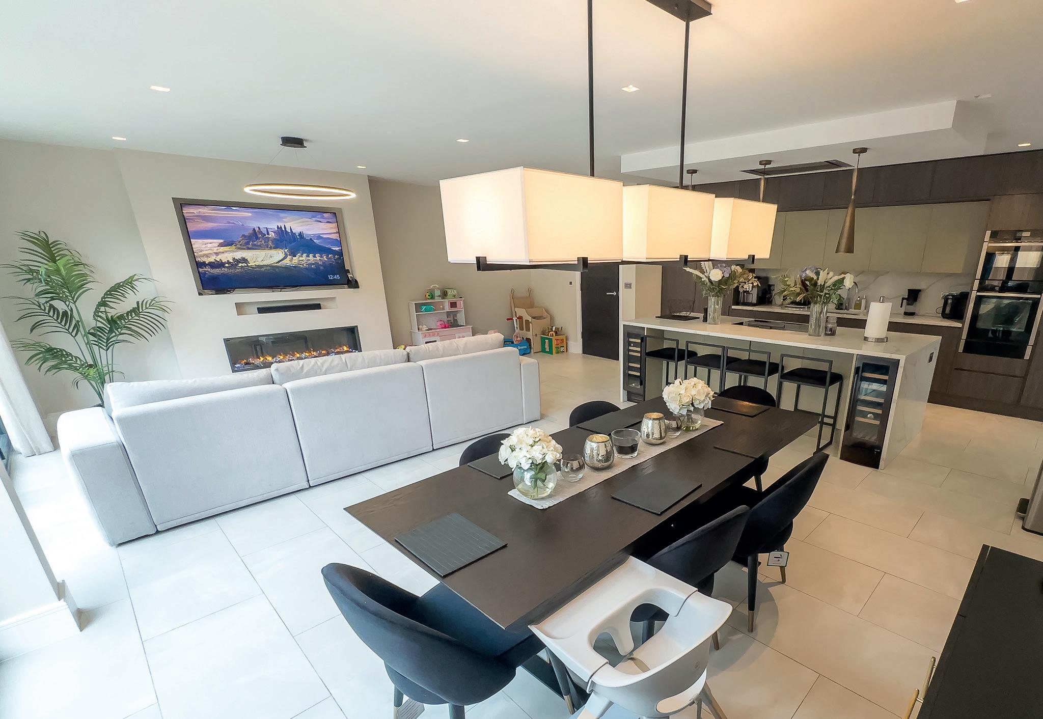 The luxury kitchen with island and abundance of space for dining and lounge area also has a bespoke media wall and inset gas fire.