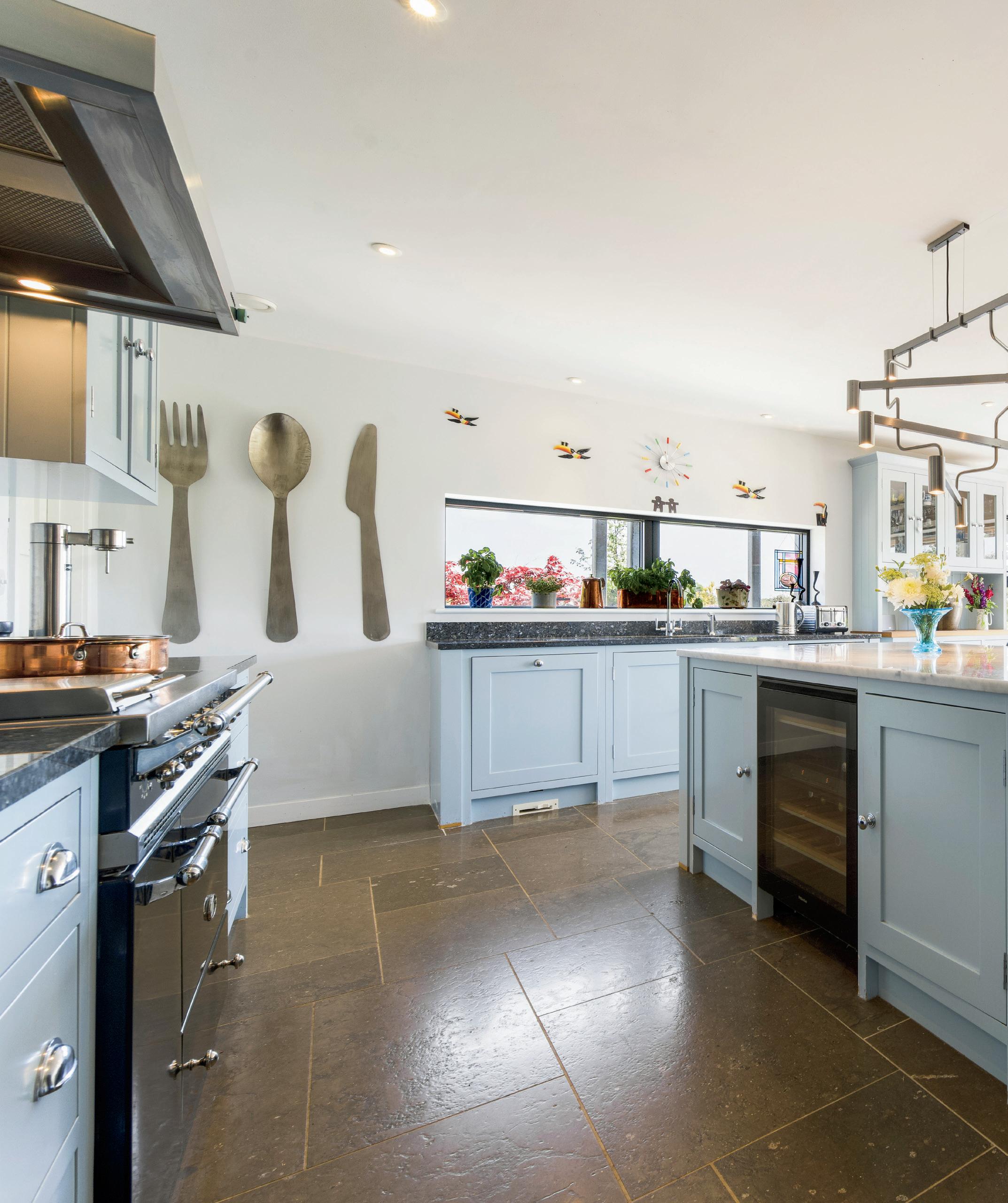 “With huge floor-to-ceiling windows throughout the ground floor, the house is always full of light and blissful uninterrupted views,” the owners continue. “This bright and airy feeling is enhanced by the open plan layout of the living spaces: we have the doors open all the time so that we can wander around the whole house as though it were a spacious art gallery. This makes entertaining a breeze, too, with plenty of room for guests to mingle and drift in and out between the house and garden.”