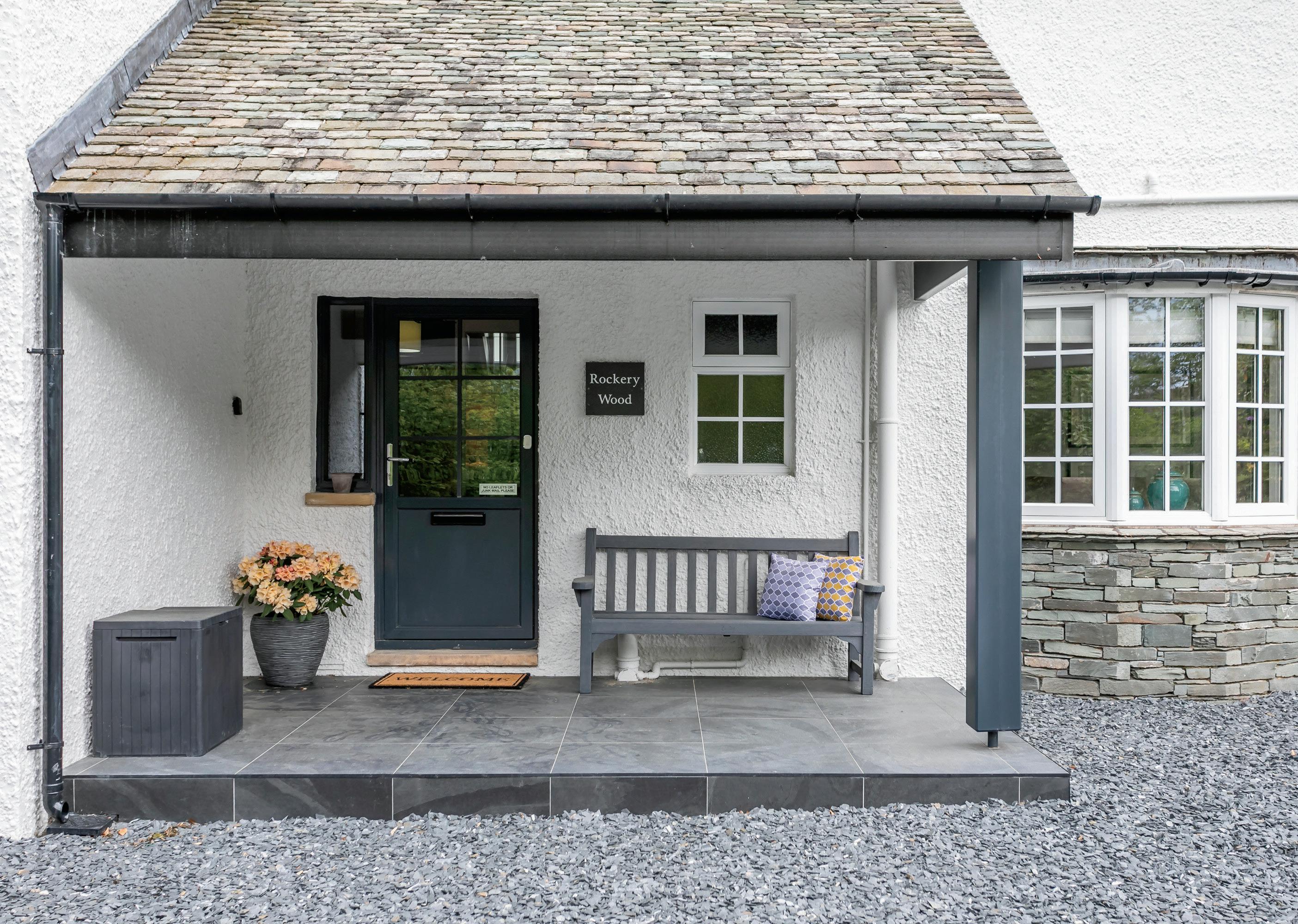 The consistent internal decorative palette of cream, grey and black coherently flows from the interior to the exterior of Rockery Wood through the greys of the slated roof, the verandah’s slate tiled floor, the slated seating terrace, the extensive driveway’s slate chippings, the original slated window cills, the smart cream painted roughcast elevations and the black rainwater goods.
