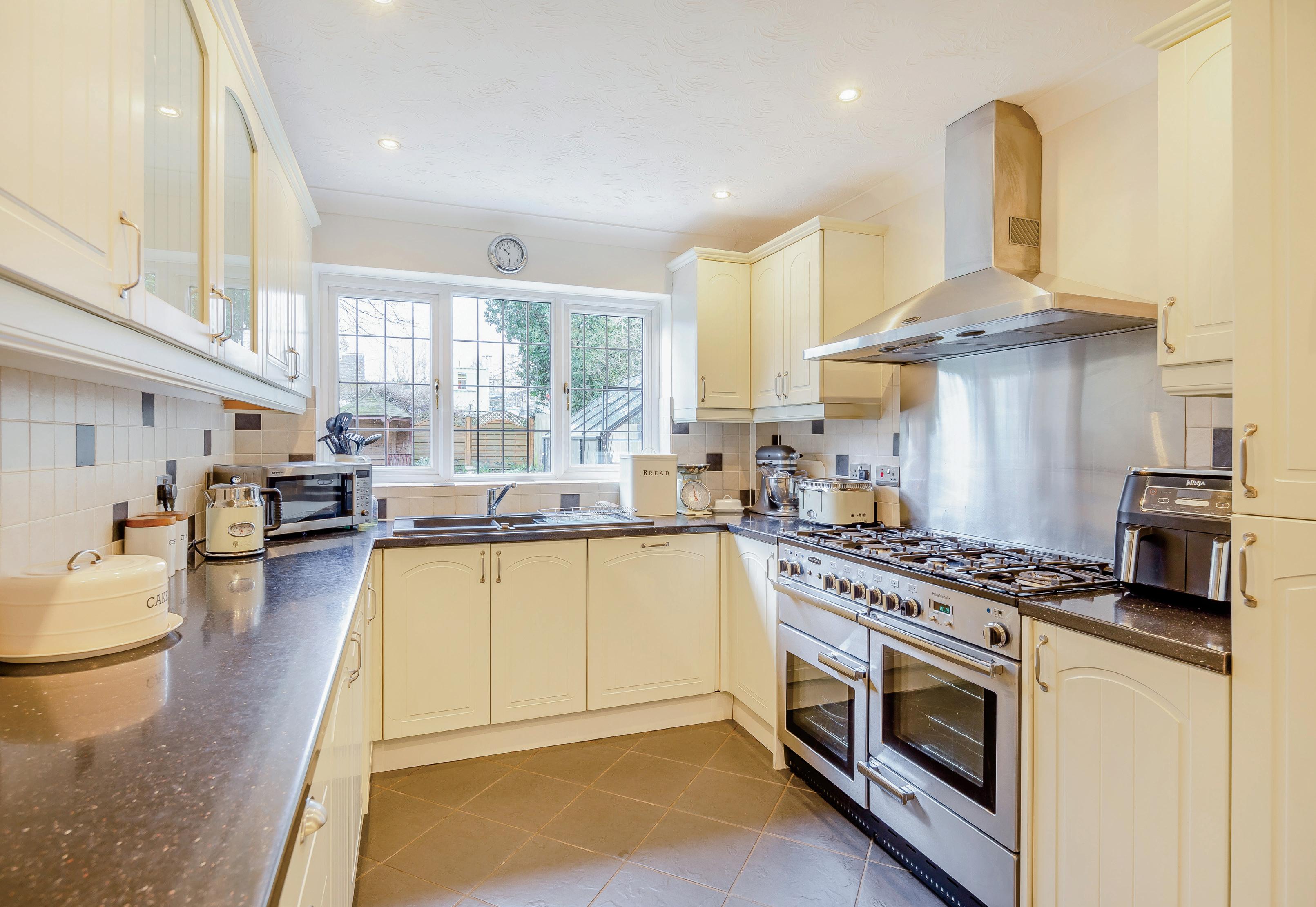 The kitchen has ample work space, a fitted Rangemaster oven, integrated fridge and freezer, along with an integrated dishwasher and a window to the rear elevation.