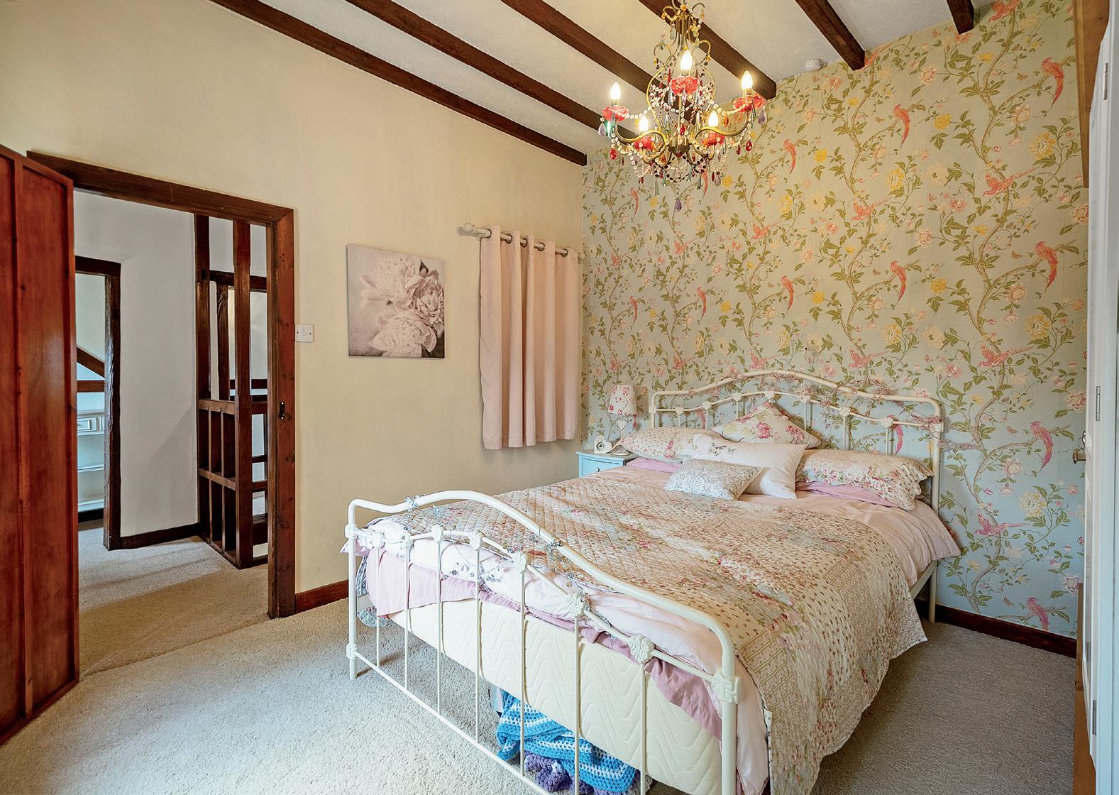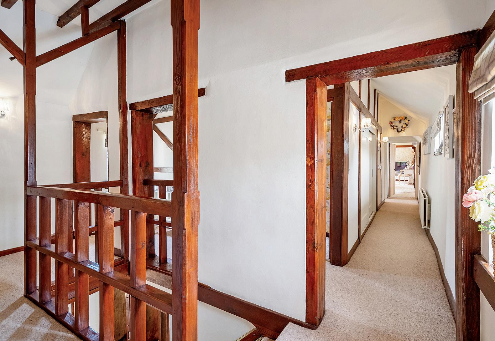 Upstairs, the principal bedroom features a luxurious en-suite bathroom, dressing room, and breathtaking countryside views. Three additional double bedrooms with vaulted ceilings and exposed beams share a stylish family bathroom.