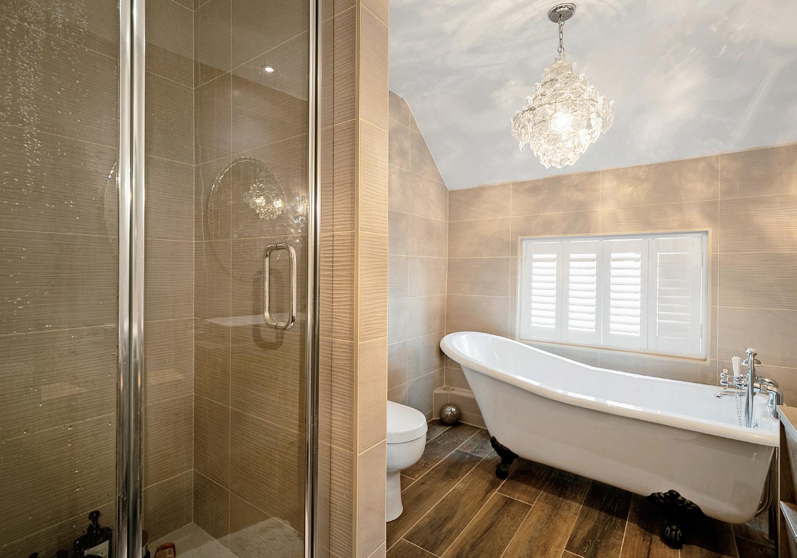The first-floor gallery-style landing guides you to the principal bedroom, featuring a dressing room, exposed wooden beams, and a luxurious en-suite bathroom with a waterfall shower, iron claw-foot bath, and double wash hand basins. The main bedroom, with its dual-aspect windows, offers stunning views of the British countryside.