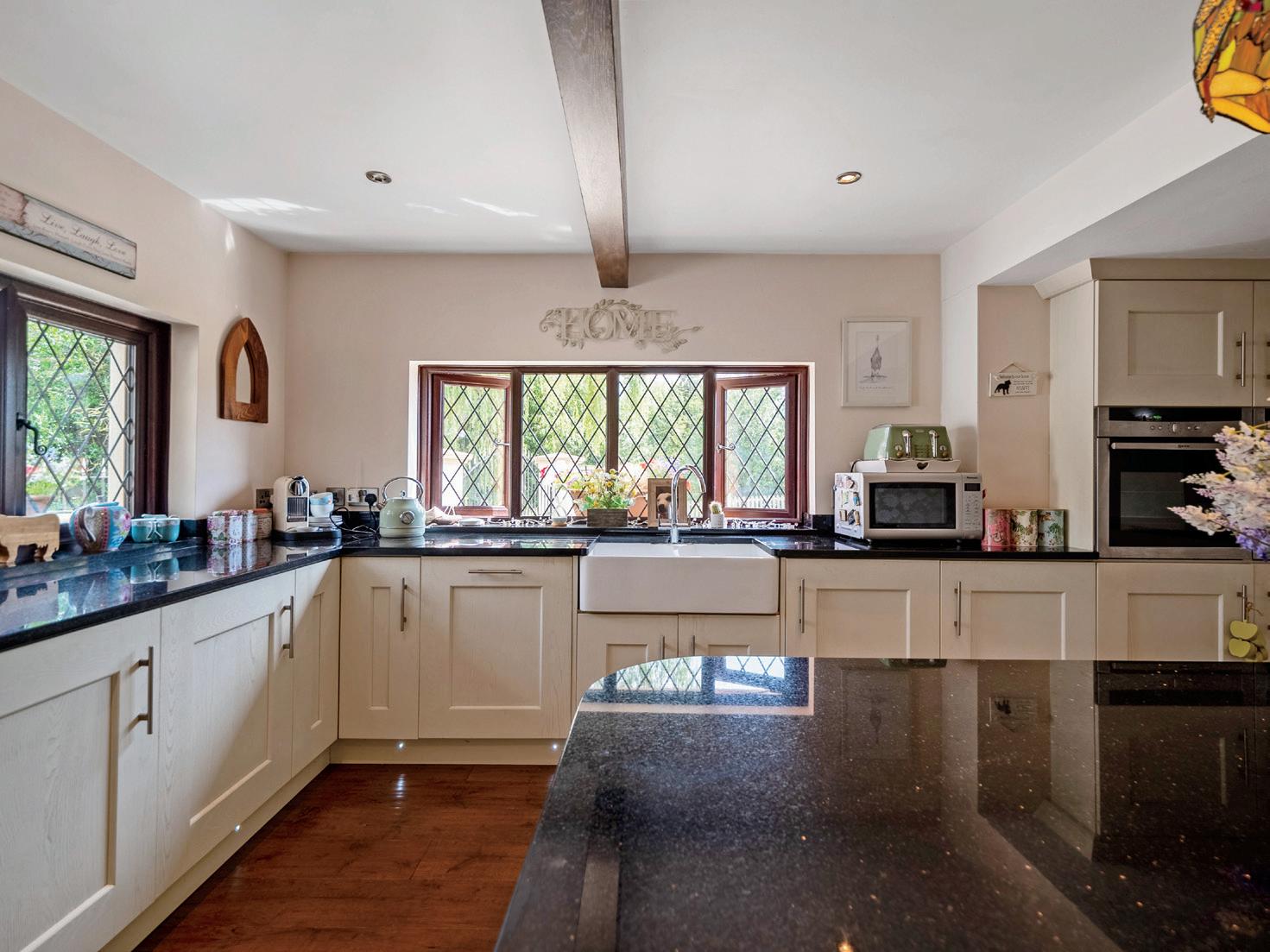 Double electronic gates open to a spacious driveway and two garages. Inside, exposed wooden beams, Inglenook fireplaces, and elegant triple-glazed windows enhance the formal reception room and cosy lounge. The orangery with bi-fold doors offers panoramic views of the serene sanctuary garden.