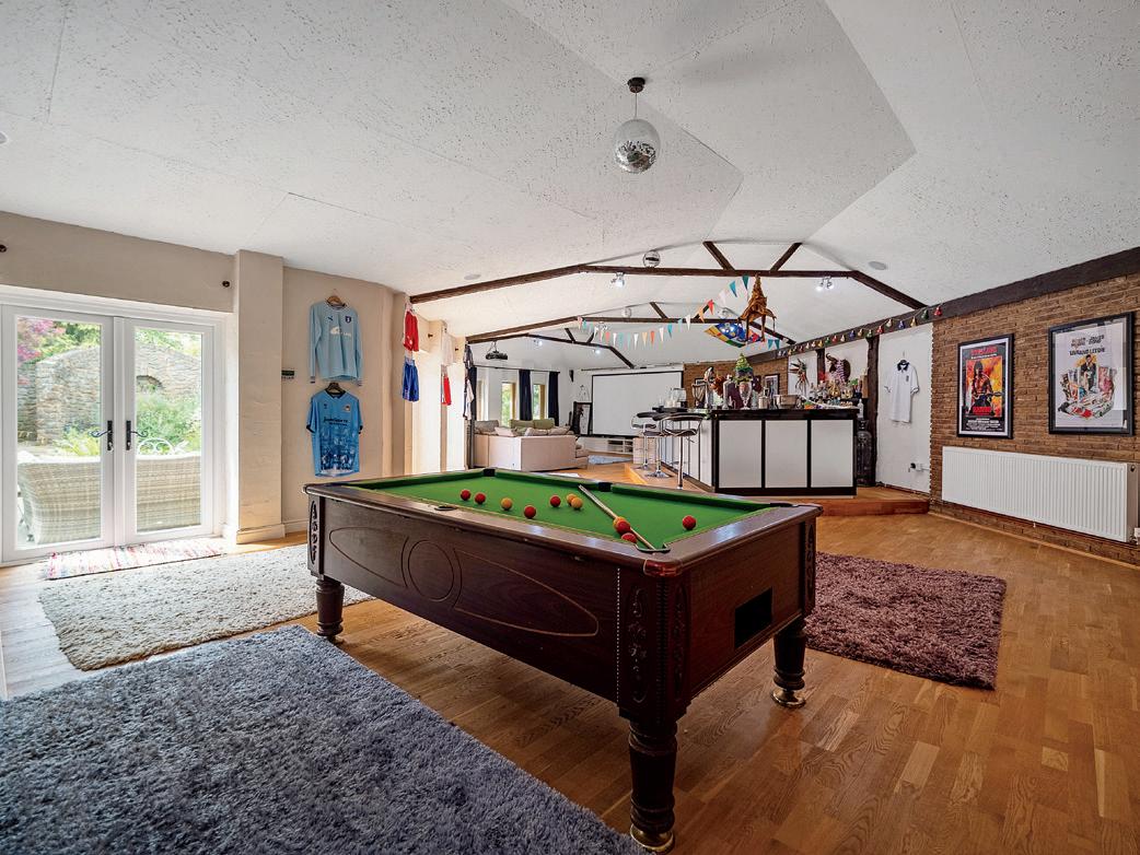 The dining room, featuring wooden flooring and a radiator, provides a charming setting for family meals and entertaining, with convenient access to the pantry and a second downstairs cloakroom. A further sitting room, perfect for a cinema room, boasts a vaulted ceiling, recessed lights, and French doors that open to the sanctuary garden. This room flows into an entertainment area complete with a bar, space for a pool table, and additional doors and windows overlooking the sanctuary and formal gardens.
