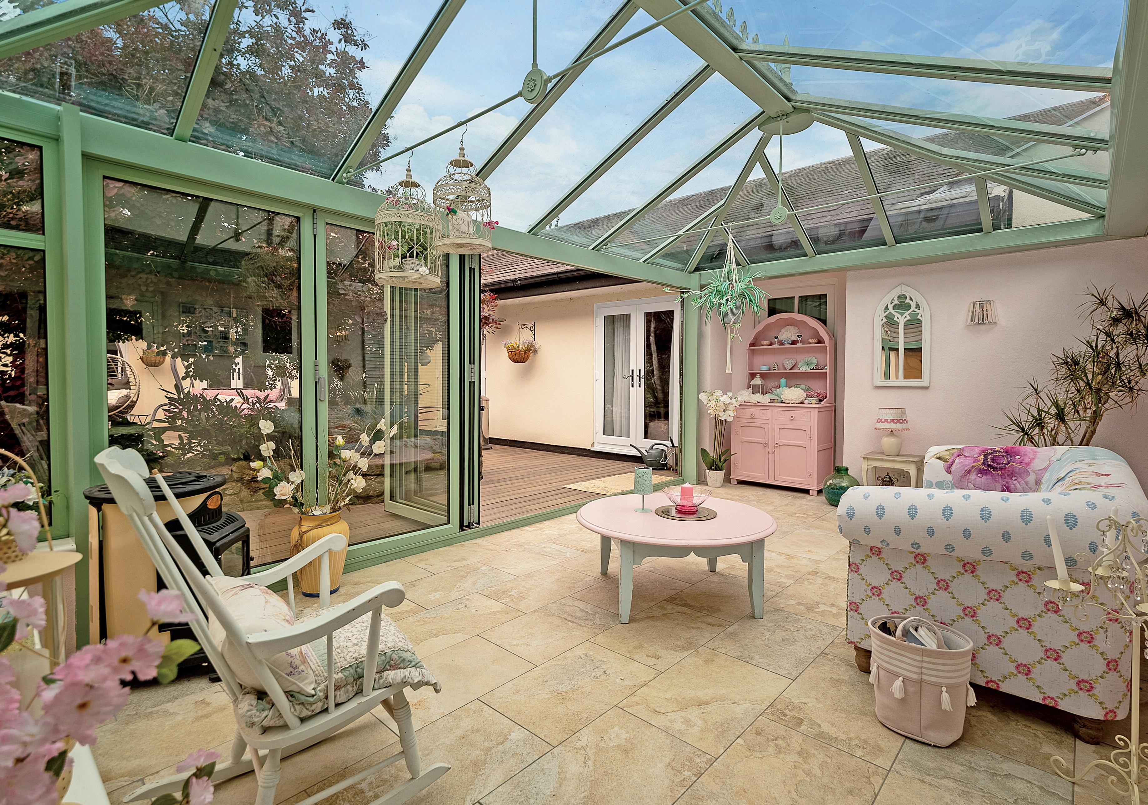 The stunning orangery, with its bi-fold doors, offers panoramic views of the sanctuary garden, seamlessly blending indoor and outdoor living spaces.