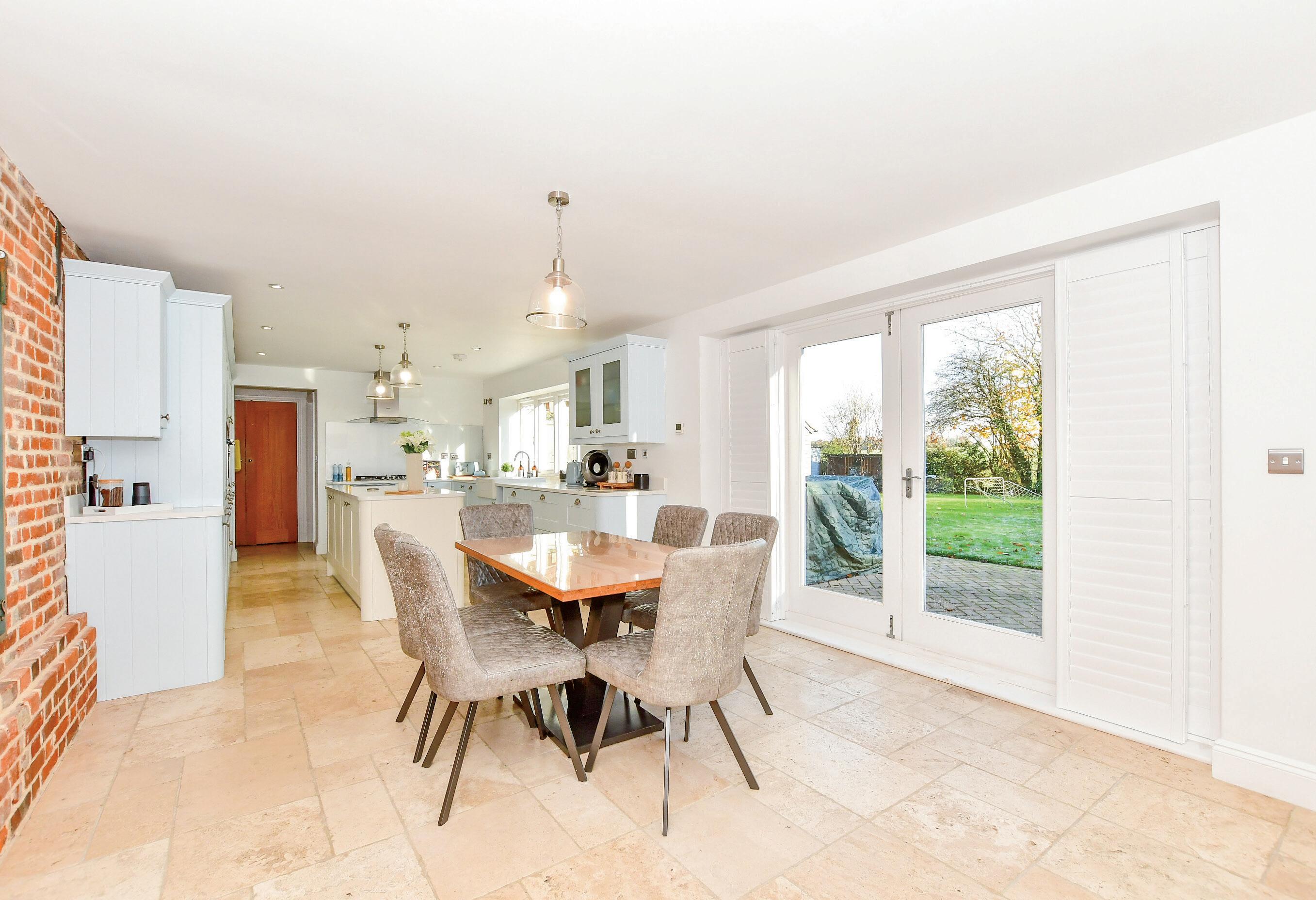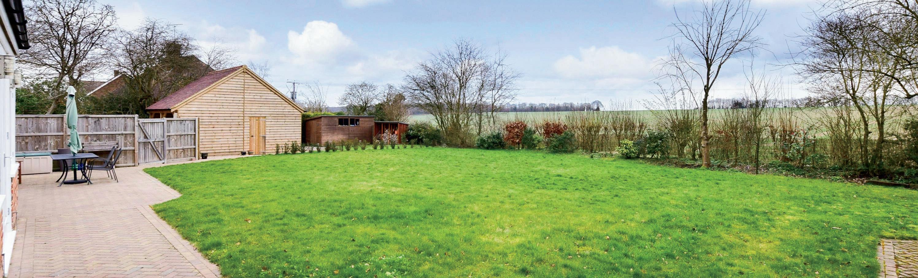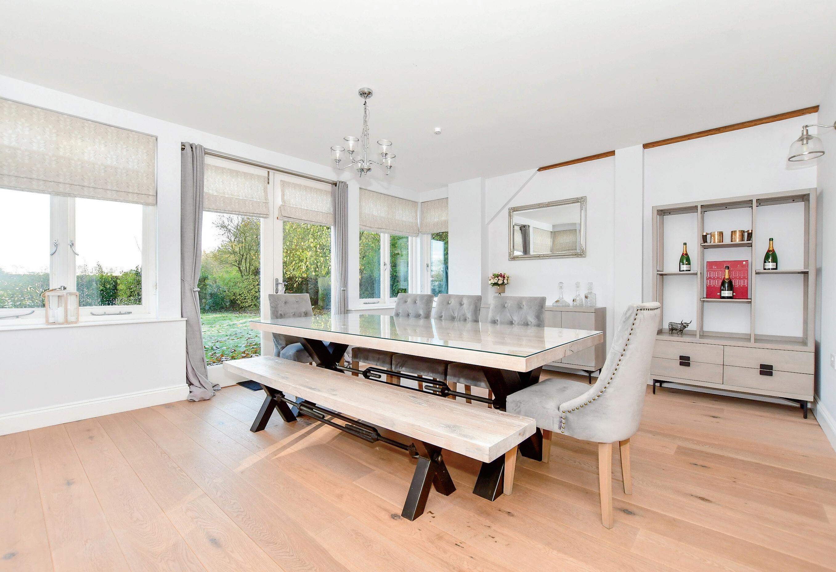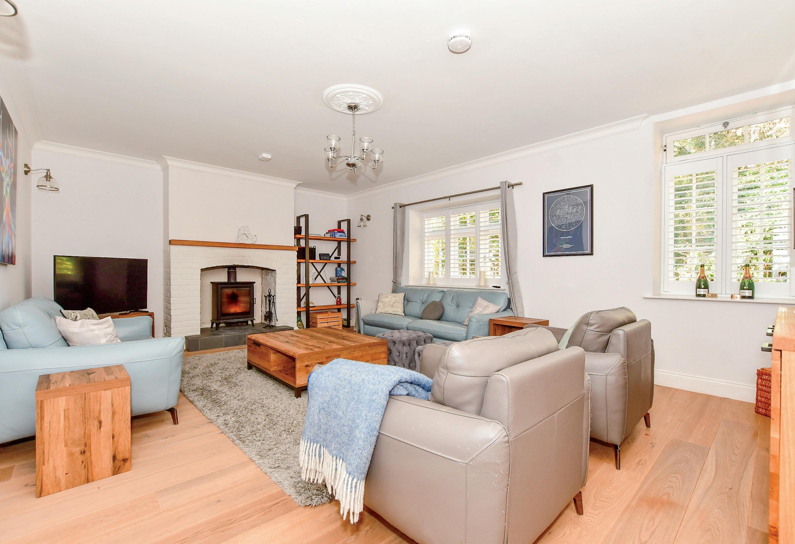 A five bar gate opens onto the main gravel driveway where you can park four vehicles and leads to the oak framed barn style double carport and the rear porch. There is a charming wraparound terrace and a large lawn that is bordered by shrubs and backs onto fields and is ideal for kicking a ball around as well as a children’s playhouse and a discreetly hidden workshop, garden storage and woodstore.