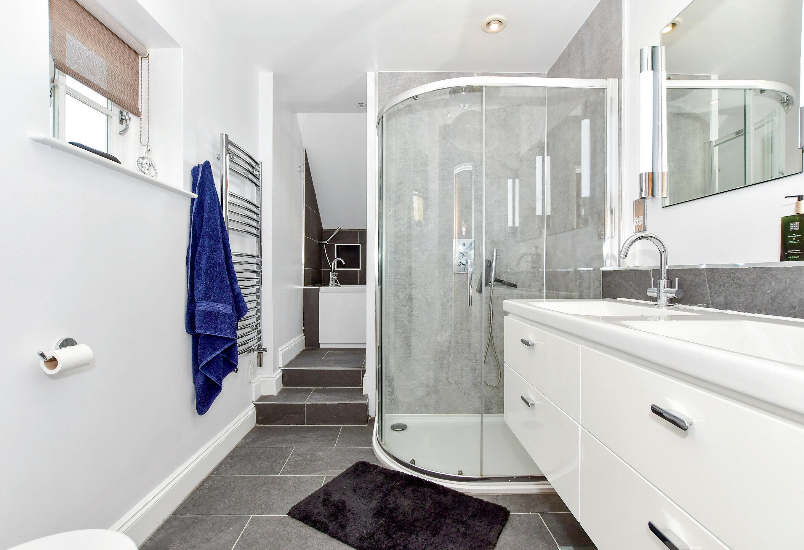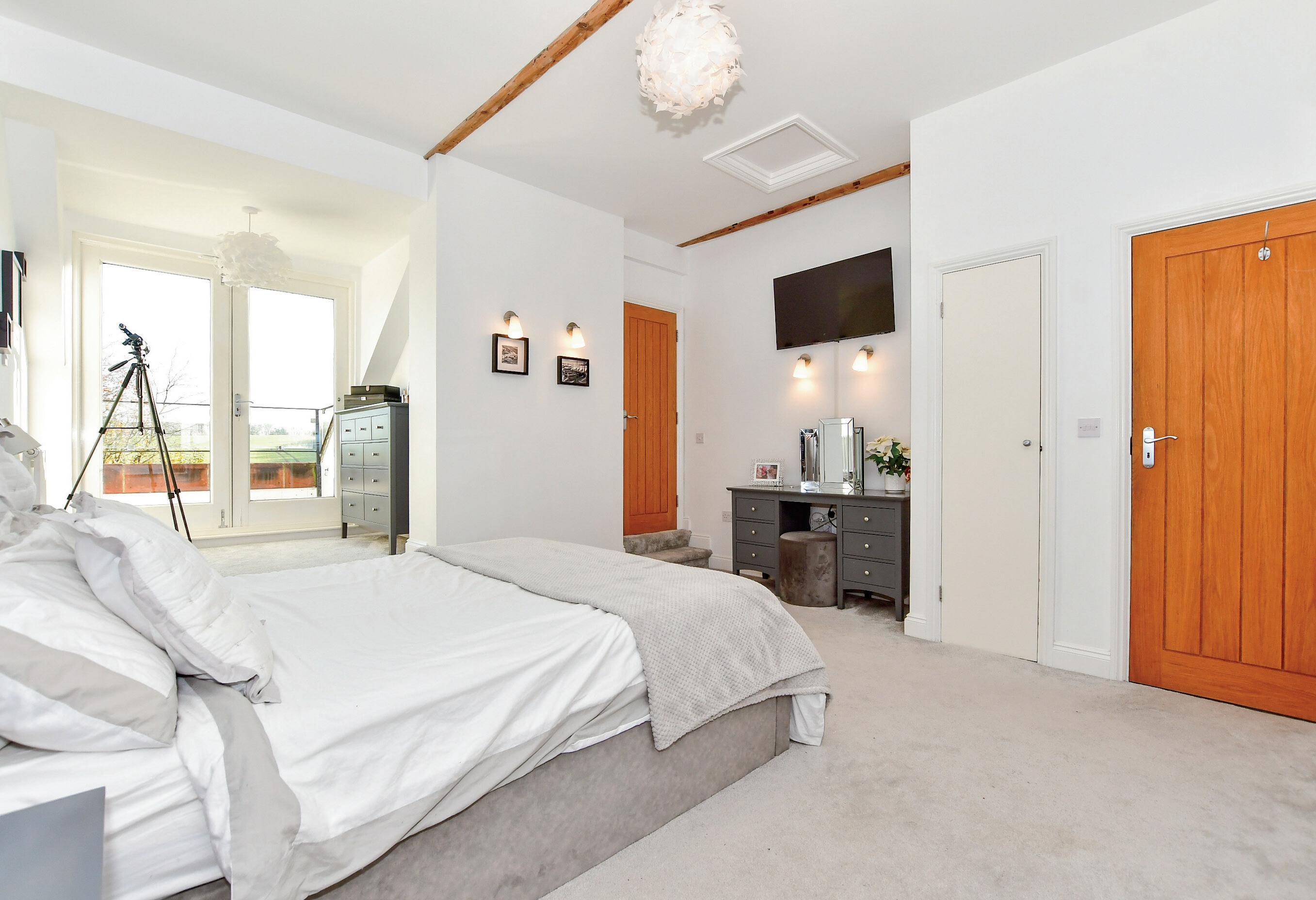 The large breakfast area can accommodate a sizeable table and chairs and includes a feature brick wall with the original ‘Three Horseshoes’ pub sign, French doors to the rear herringbone brick terrace and steps up to the light and bright dining room that has a large box bay window and French doors to the garden and where family and friends will be delighted to enjoy a more formal or celebratory lunch or dinner. It has a wide archway to the ‘snug’ with its built in bookshelves, attractive fireplace, oak mantle and log burning stove. This has a door to the elegant sitting room that has a coved ceiling, lighting rose and a stone fireplace with a log burner and access to a good sized office where you can gain inspiration from the delightful views while you are working. There is also an adjacent/en suite cloakroom so this office could always be a bedroom for family members or guests who find the stairs difficult.