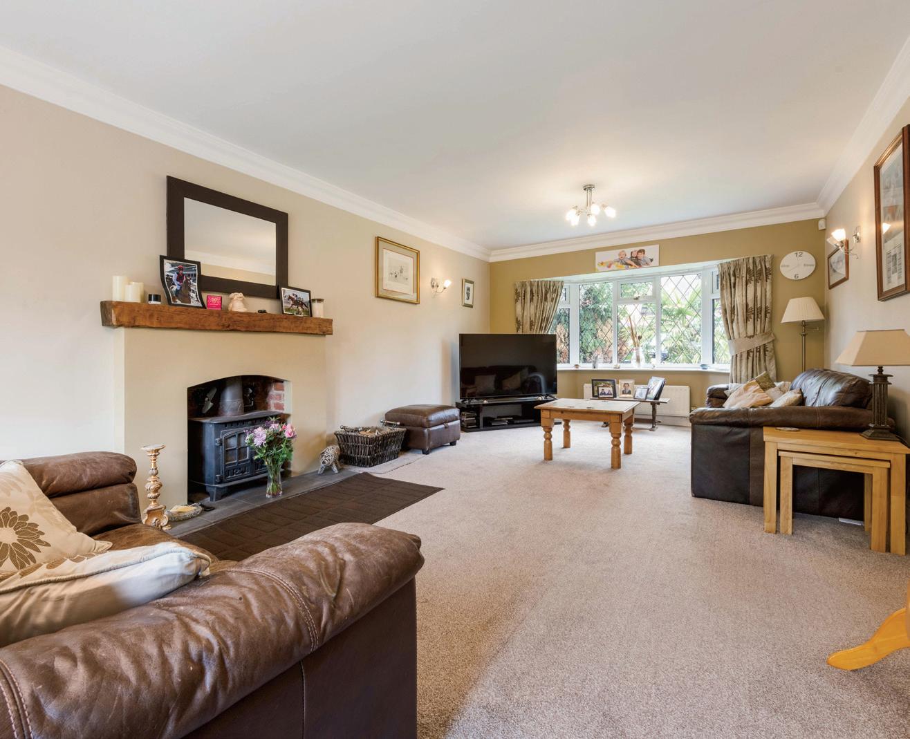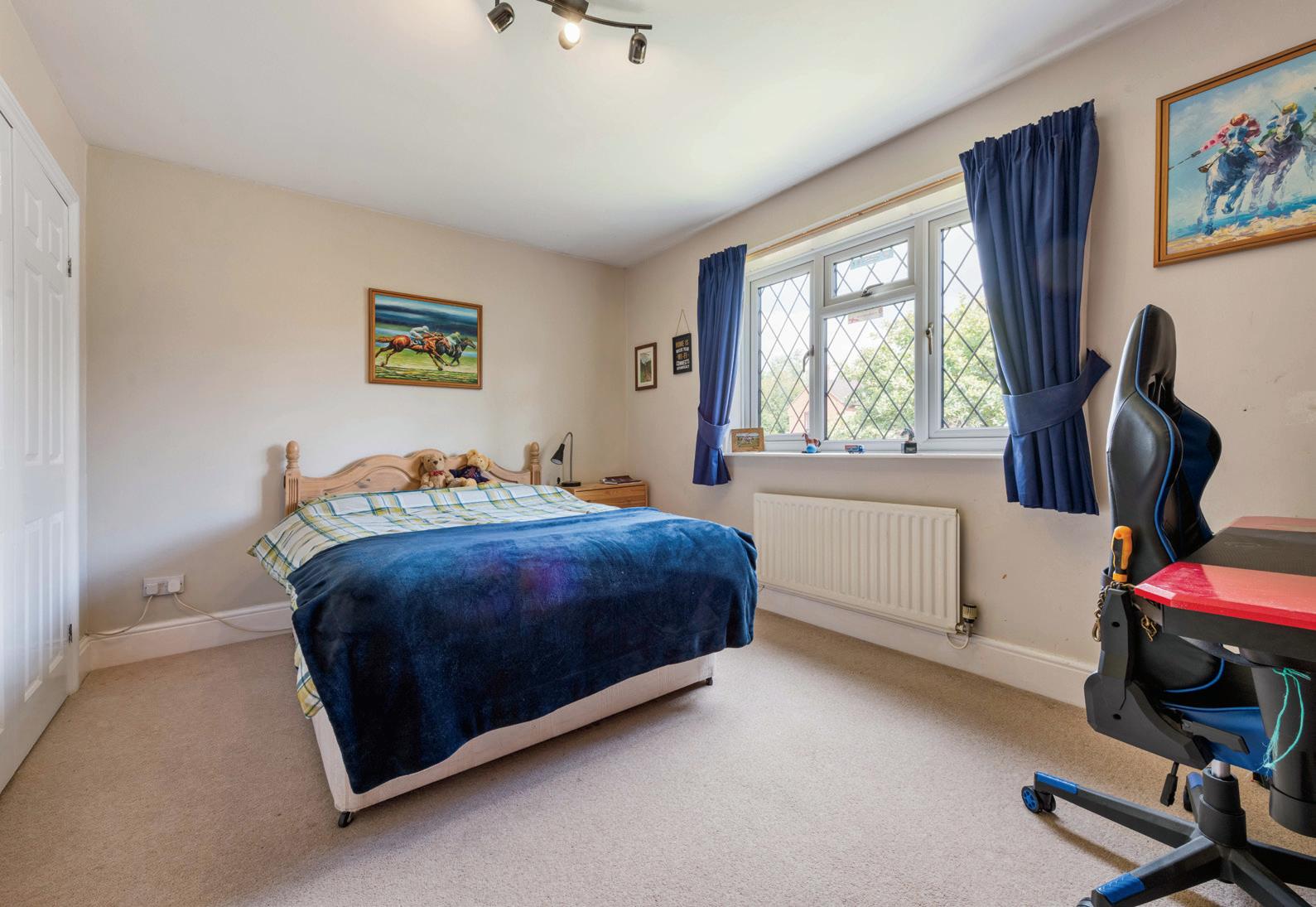 Outside: The southerly facing garden catches the sun throughout the day, and the wraparound lawns to the side and frontage take advantage of this, making an ideal spot for alfresco dining or breakfast on a bright summer’s morning. Double garaging adds to the pretty frontage of this home, as well as mature trees and foliage on the front lawns, and there is private parking for four vehicles.