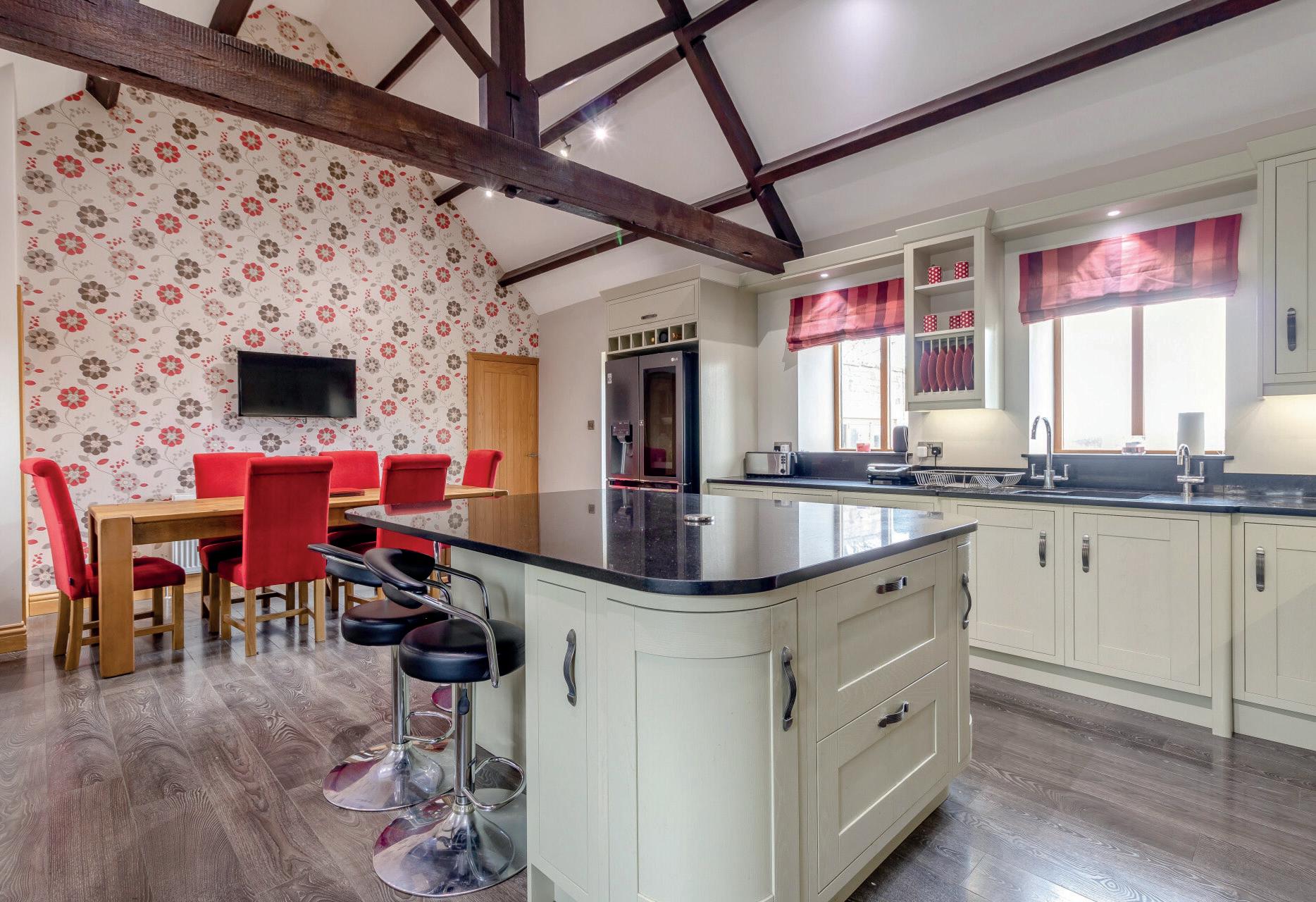 The inner hall leads through to the breakfast kitchen; a stunning room, enjoying exposed beams and trusses into the apex of the building, there are windows to two aspects and a personal door opening to the garden terrace. Presented with a comprehensive range of bespoke furniture, complimented by black Granite worksurfaces incorporating a drainer and having an inset stainless-steel sink with a mixer tap over and an additional Instant hot tap. A central island has a granite surface extending to a breakfast bar, with useful cupboards beneath, and a complement of appliances includes an integral dishwasher, space for a larder style fridge freezer, and a Rangemaster stove consisting of a double oven and grill with a five-ring induction hob over, a glass splash back and an extractor canopy.